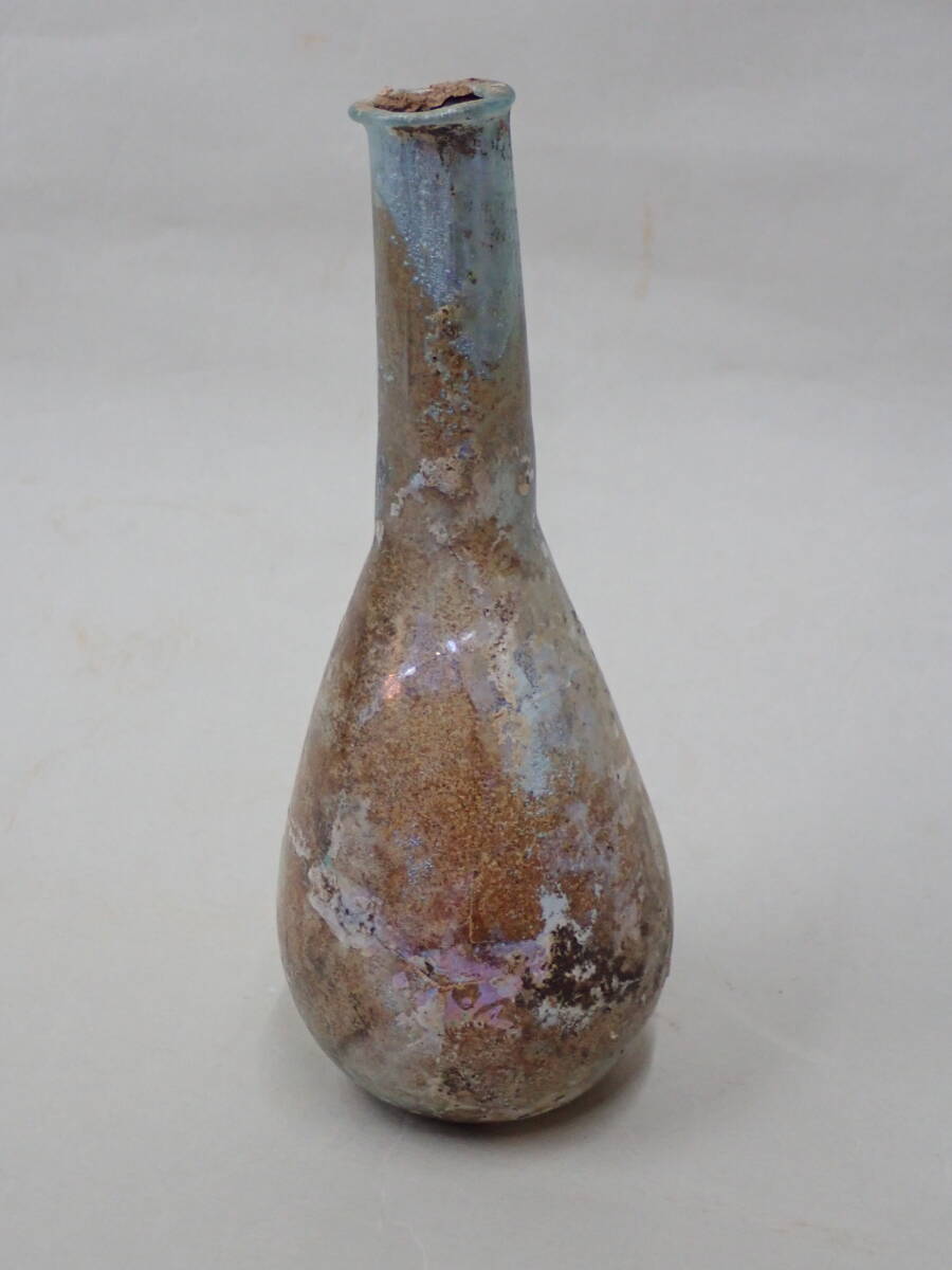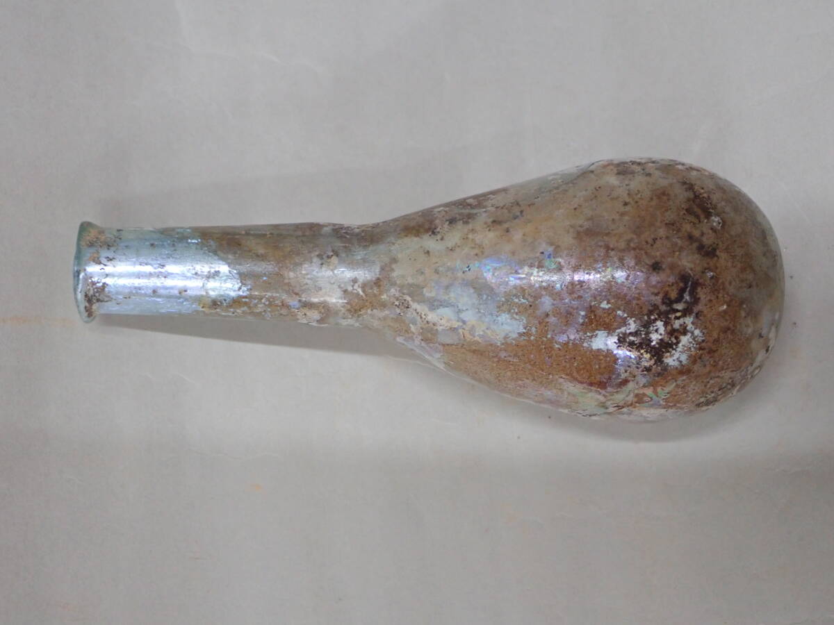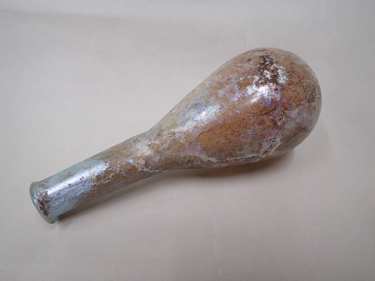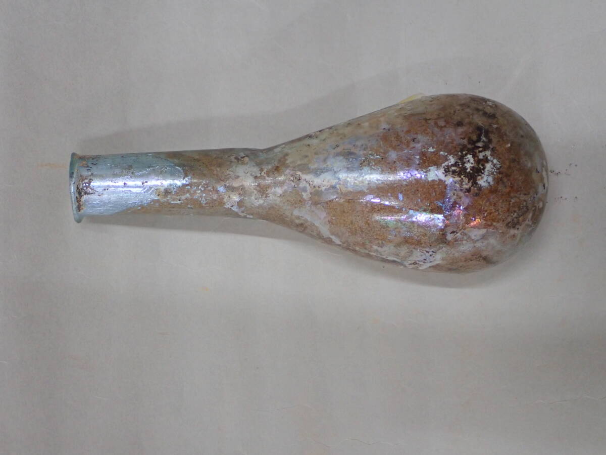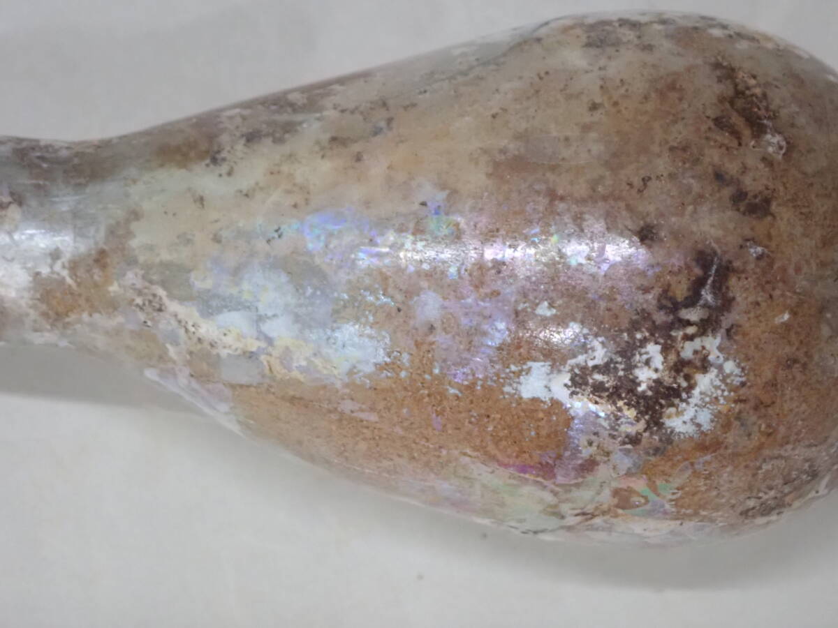 全体に銀化が見られる美しい方とのローマンガラです。状態もよくガラス本来の透明度のあるローマンガラスです。ほぼ全面に銀化も見られます。香油瓶などとして使用されたものと思われます。どうぞよろしくお願いいたします。 高さ約14.5cm