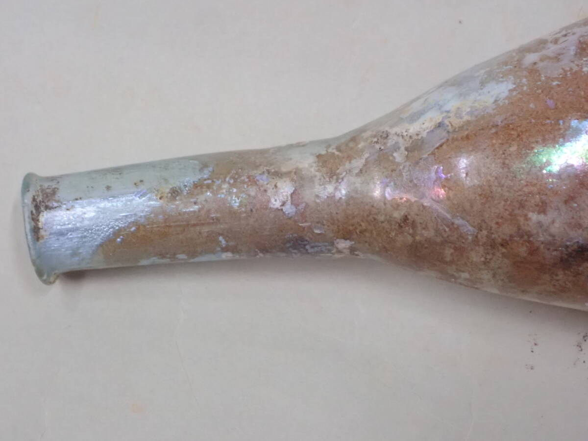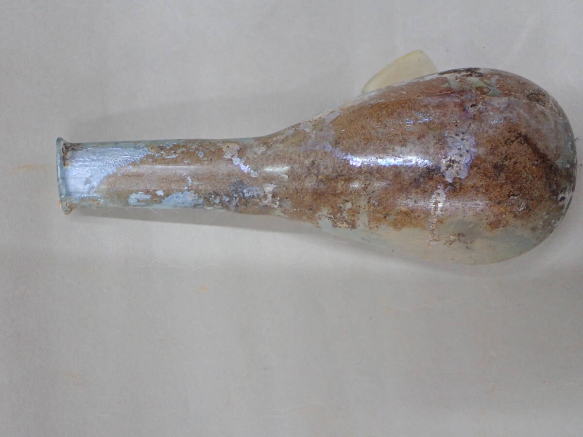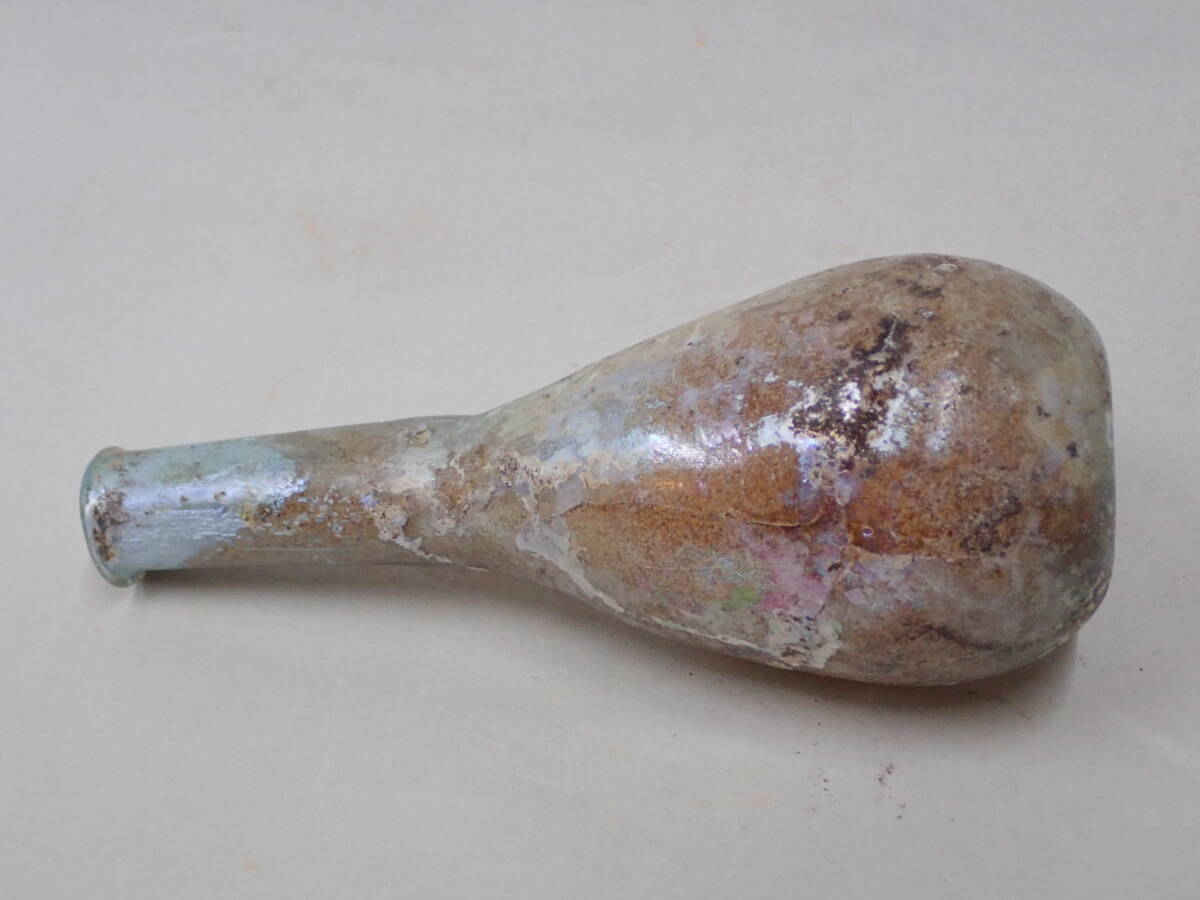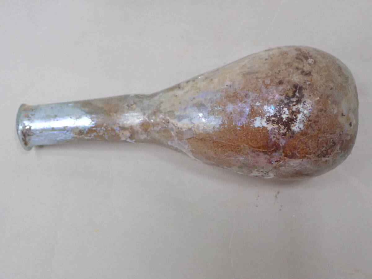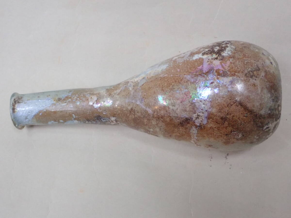 全体に銀化が見られる美しい方とのローマンガラです。状態もよくガラス本来の透明度のあるローマンガラスです。ほぼ全面に銀化も見られます。香油瓶などとして使用されたものと思われます。どうぞよろしくお願いいたします。 高さ約14.5cm