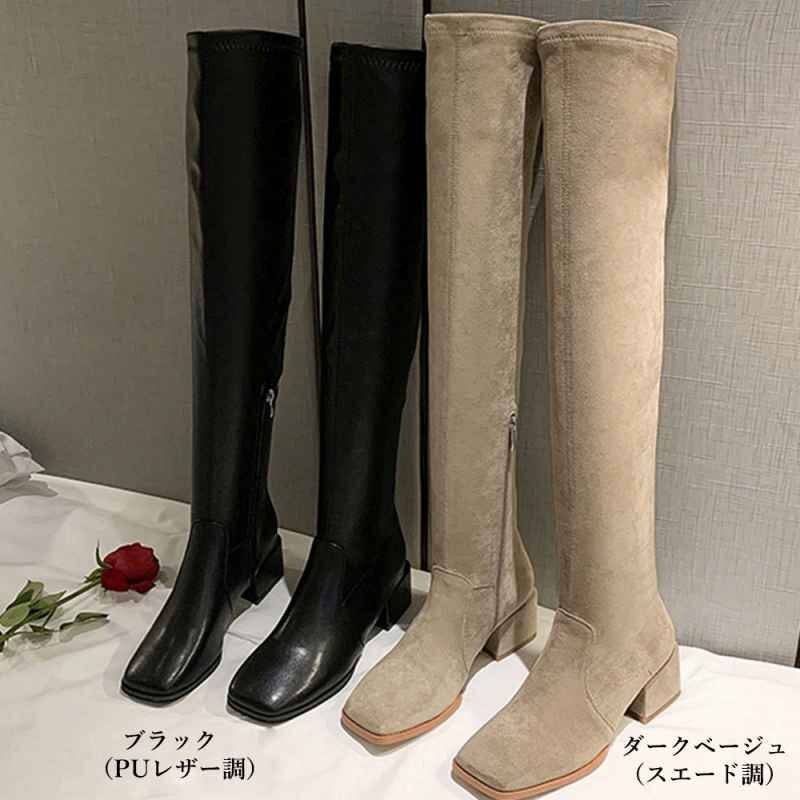 ニーハイブーツ スクエアトゥ 美脚ブーツ 23.0cm(36) ブラック(PUレザー調)