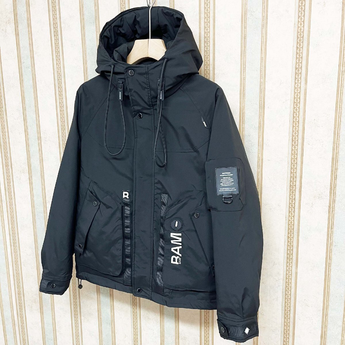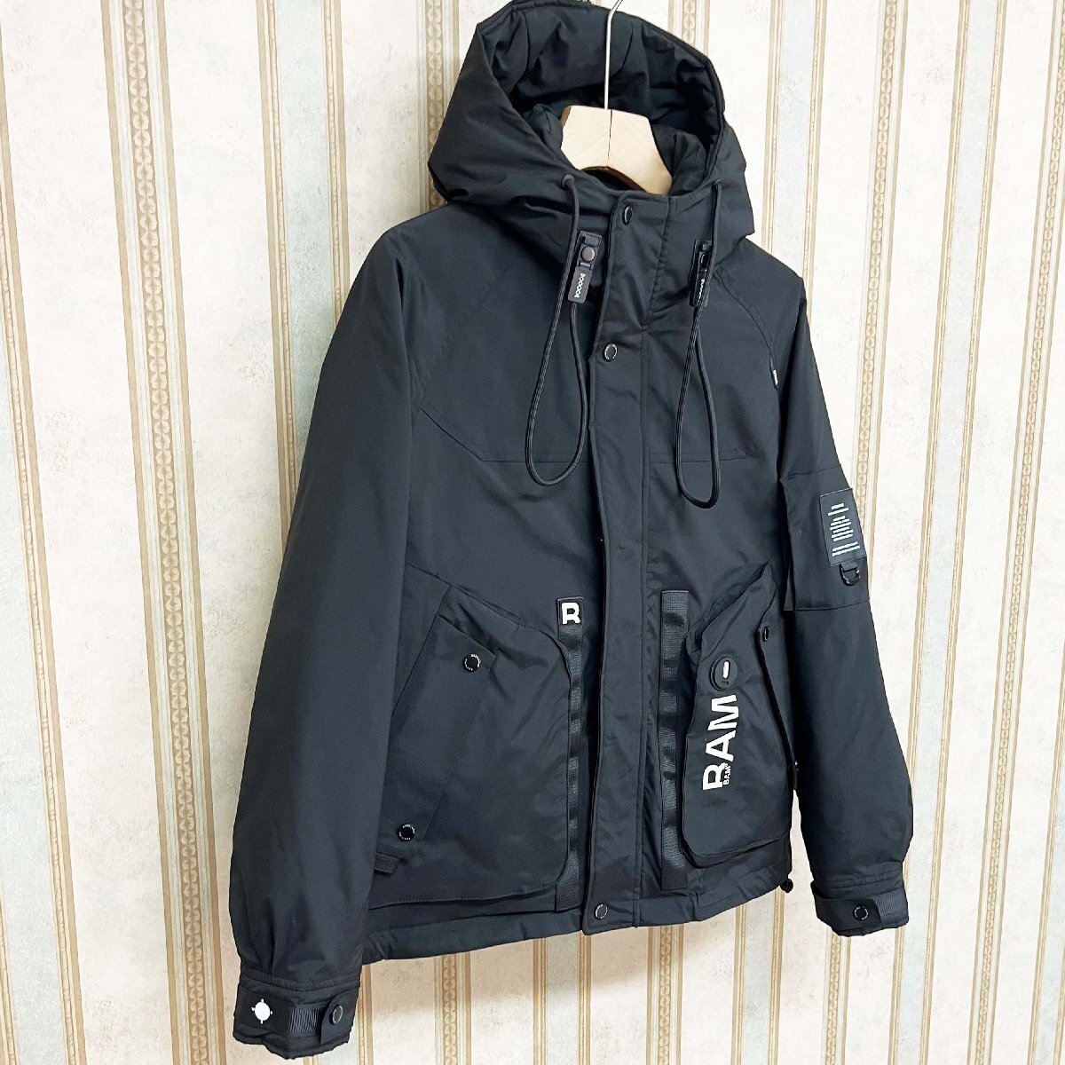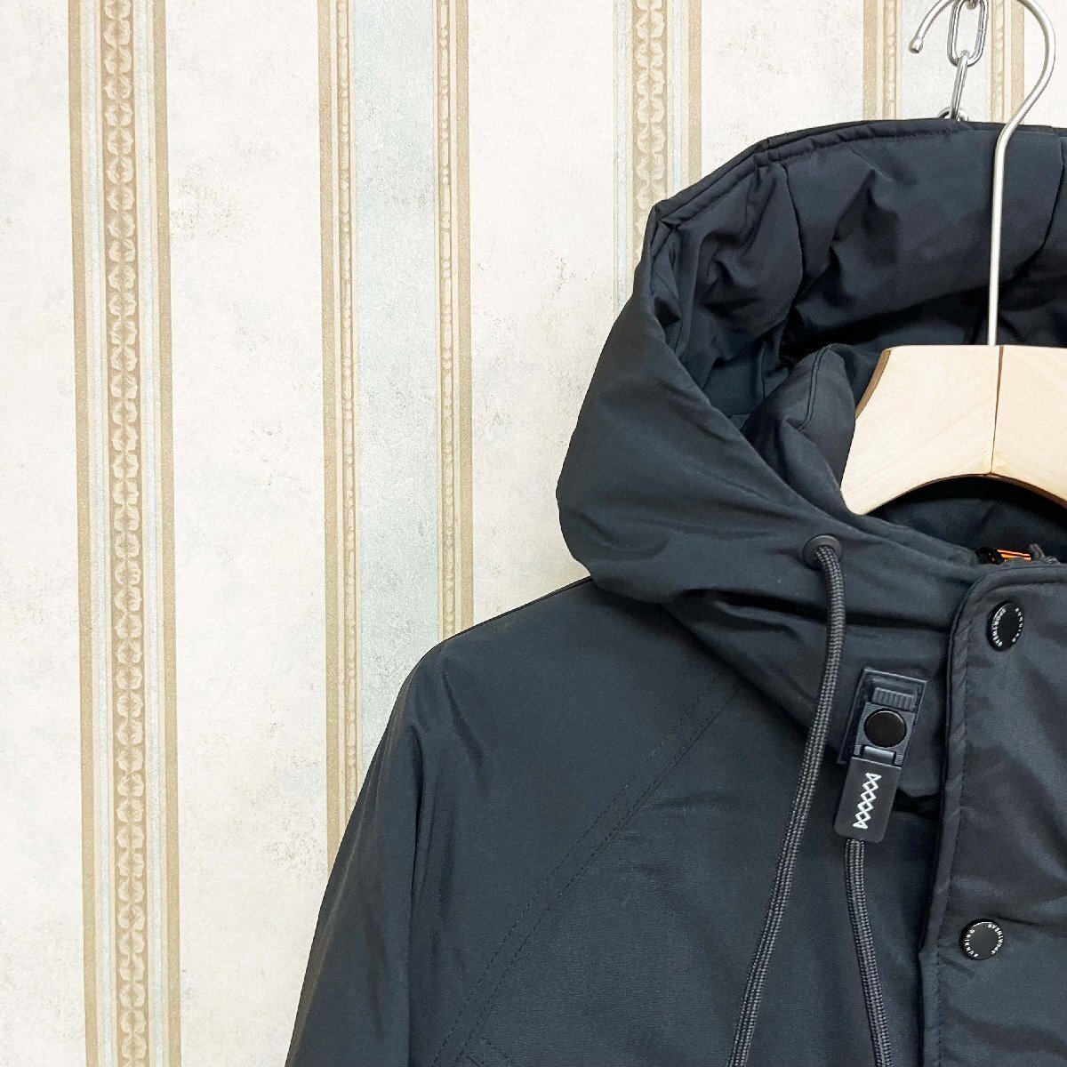 ダウンジャケットと一体のフードと裾には、ドローストリングが付いており、引き締めることで寒風の侵入を防ぐことができます。両サイドには大容量のジップポケットがあり、収納力が抜群です。内側には隠しポケットもあり、貴重品を安心して収納できます。左袖とバックの英字はポイントで、カジュアルスタイルがこなれ感のある印象に。