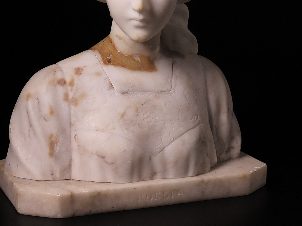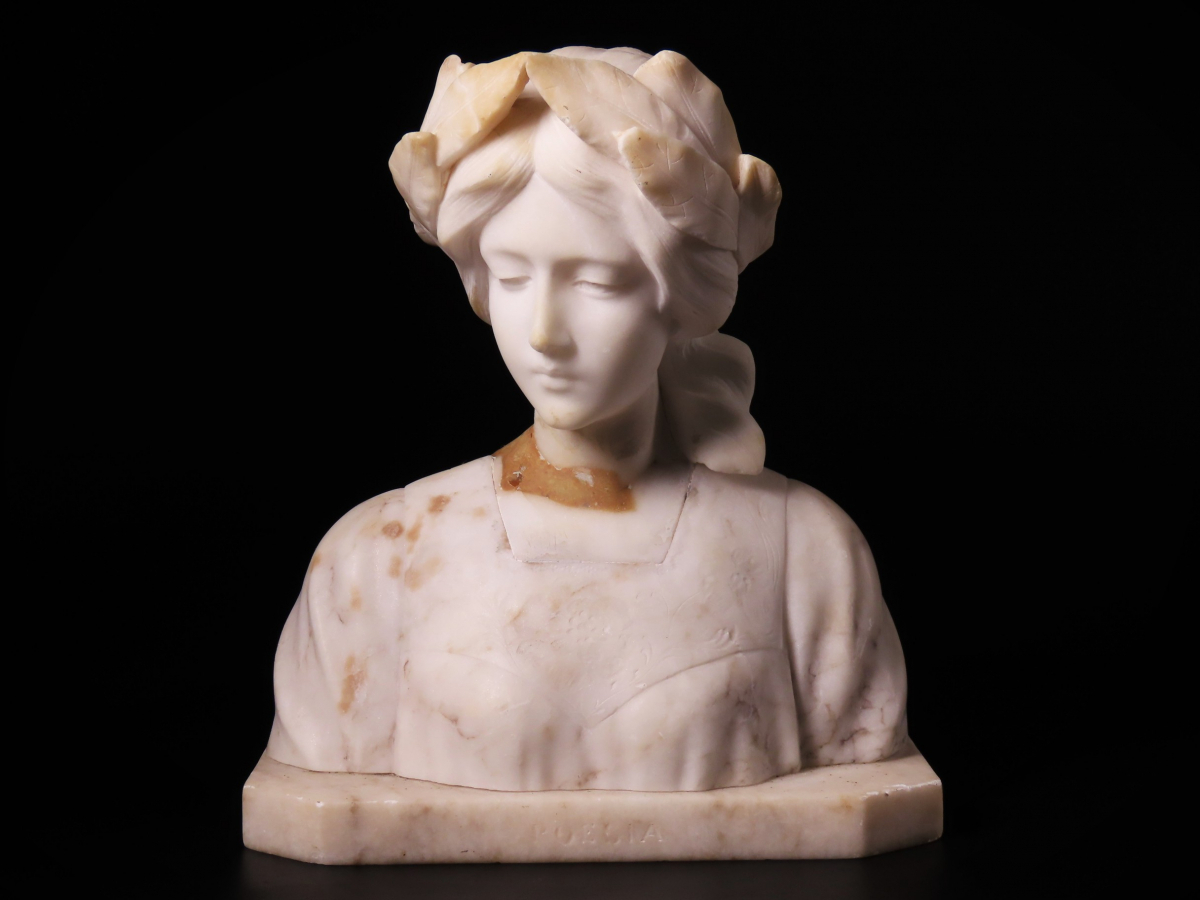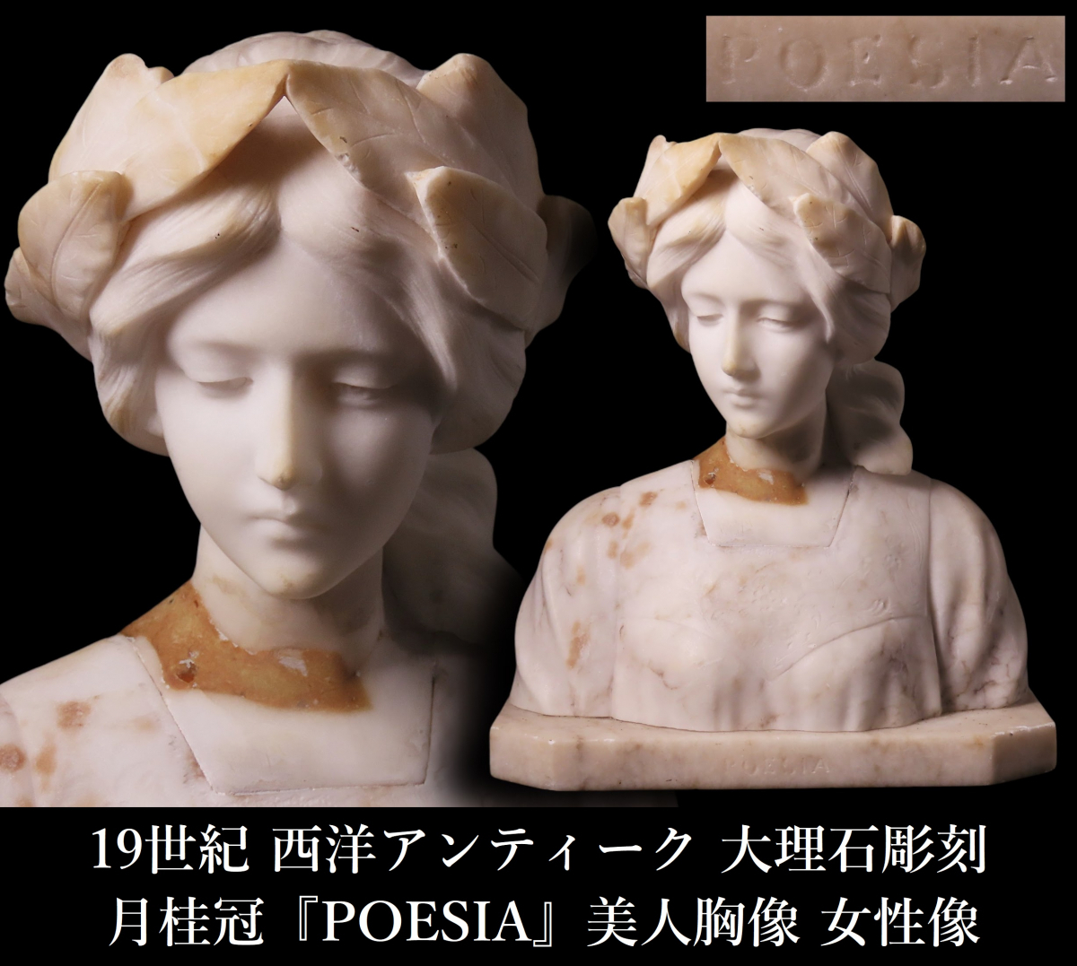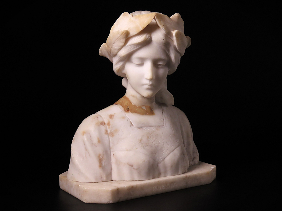 【ONE'S】19世紀 西洋アンティーク 大理石彫刻 月桂冠 『POESIA』 美人胸像 女性像 高22.5cm 重量3.5kg 西洋美術 | |||