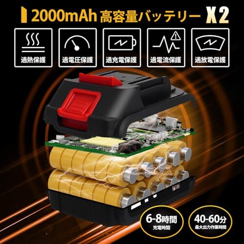 【2000mahバッテリー&高炭素鋼ブレード 】2000mahの大容量バッテリー2個を装備し、バッテリー容量は市販の汎用バッテリーの約2倍です,長時間連続作業が可能です。また、耐摩耗性に優れた8枚の白色高炭素鋼ブレードが付属し、木工、金属加工、大型廃棄物の解体作業など多用途に対応します。 (※この往復鋸は高出力のため、長時間の使用は手首に負担がかかるのでご注意ください)