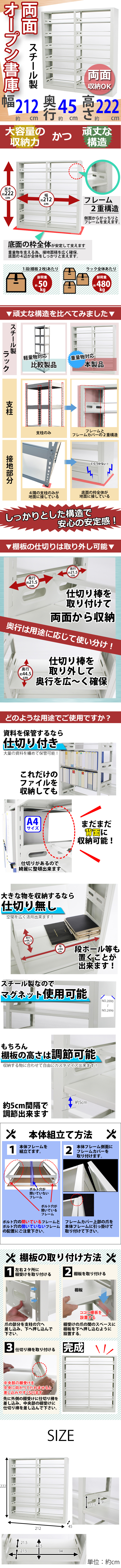 | 商品紹介 | ◇◇スチール製 両面オープン書庫◇◇ ◇頑丈なスチール製の両面オープン書庫です。 ◇資料を大量に保管出来るので仕事場でも大活躍! ◇フレーム2重構造でしっかりとした安定感。 ◇底面枠全体が接地するのでぐらつきません。 ◇錆びにくいのでお手入れも簡単です。 ◇素材:スチール ◇耐荷重:約25kg /(棚板1枚) 約480kg /(ラック全体) ◇重量:約103kg ※こちらの商品は、組立て式です。 (プラスドライバーとスパナ(10mm、12mm、14mm)をご用意下さい。) |