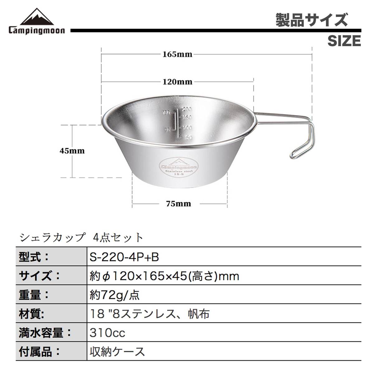 キャンピングムーン(CAMPING MOON) キャンプ用 コップ ステンレス シェラカップ 310ml 4点セット 収納ケース付 S220-4