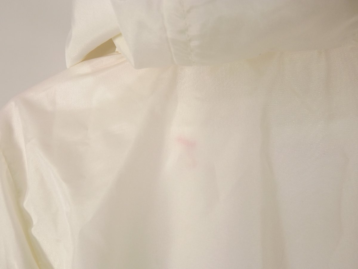 状態は表は目立つものはありません。赤い糸のようなものはフードで隠せます。小汚れは内側なので見えないと思います。