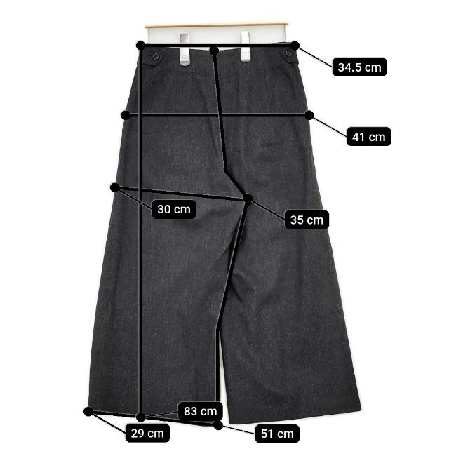 | 実寸サイズ | 総丈:約83cm ウエスト:約34.5cm 股上:約35cm 股下:約51cm ヒップ:約41cm ワタリ幅:約30cm 裾幅:約29cm ※採寸画像がある商品はハンガーに吊るした状態での計測のため、平置きでの採寸とは差が生じる場合がございます。平置きでの実寸サイズをご希望の場合は、ご購入前に必ずご質問ください。 ※記載以外のサイズが合わないことを理由とした返品はできませんので、 記載部分以外で実寸サイズの気になる箇所があれば必ず購入前にご質問ください。 |
