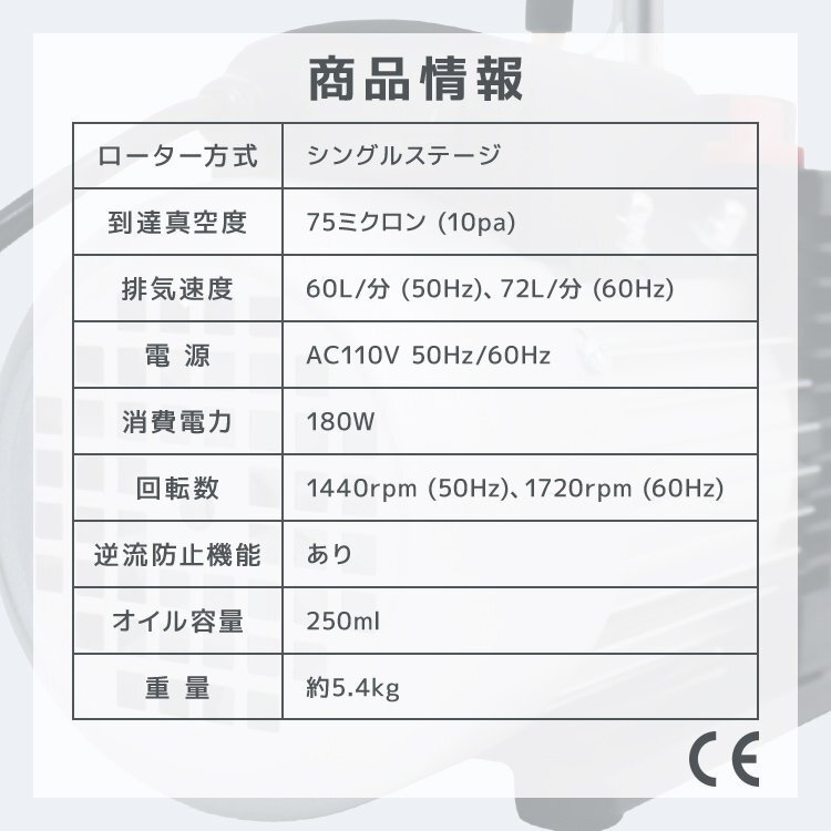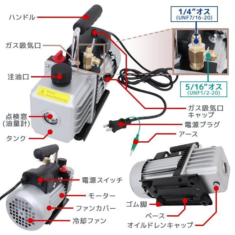 | 【仕様】 ローター方式:シングルステージ 到達真空度:75ミクロン 排気速度:60l/min(50Hz) 72l/min(60Hz) 電源:AC110V 50Hz/60Hz 消費電力:180W 回転数:1440rpm(50Hz) 1720rpm(60Hz) 吸気口径:1/4フレア(UNF7/16-20) サイズ:120W×250D×230H 重量:約5.4kg 逆流防止:あり オイル封入量:250ml 付属品:真空ポンプオイル / 英文取扱説明書 |