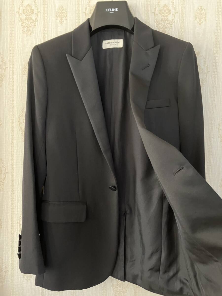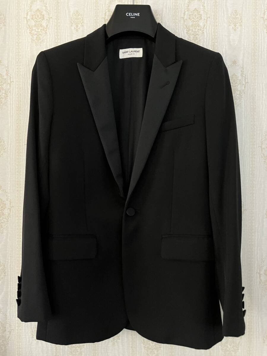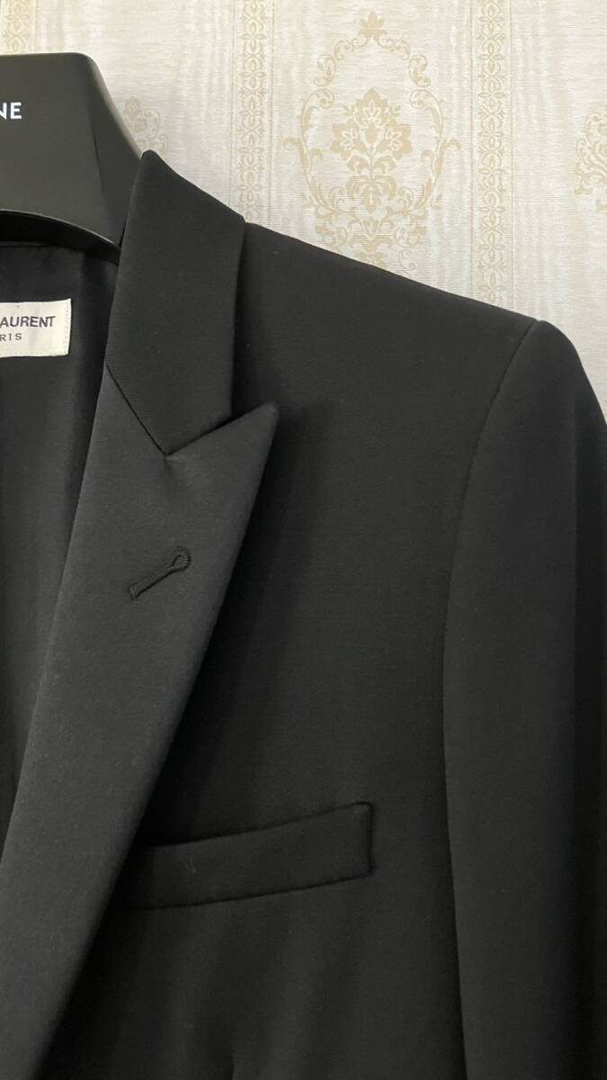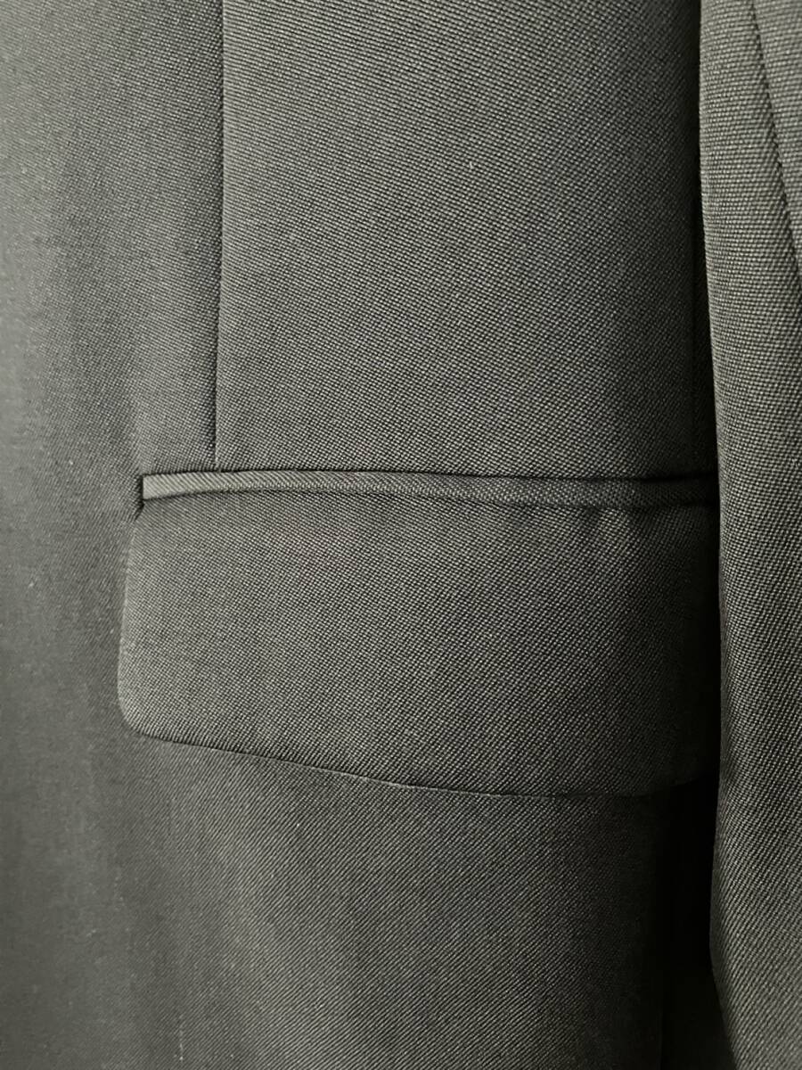 エディスリマン在籍時2015年モデルですぐ完売したものです。肩幅と身幅が大きめに作られ、ウエスト1ボタンで一気に絞り切るタイプで現在でも非常に人気が高いものです。エディスリマンのピークドラペルは位置が独特のため顔わまりが端正に見えます。