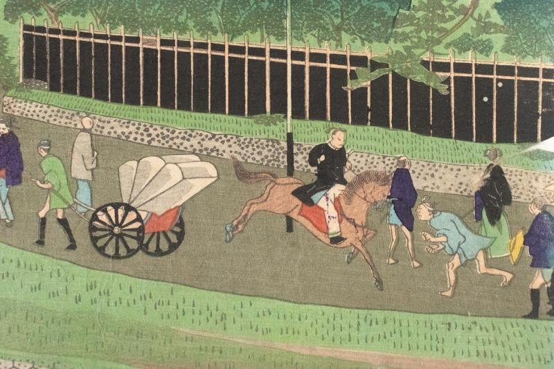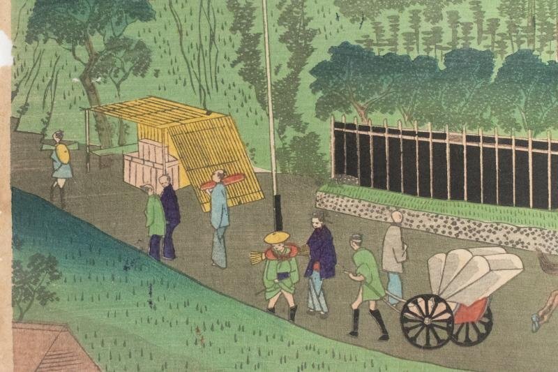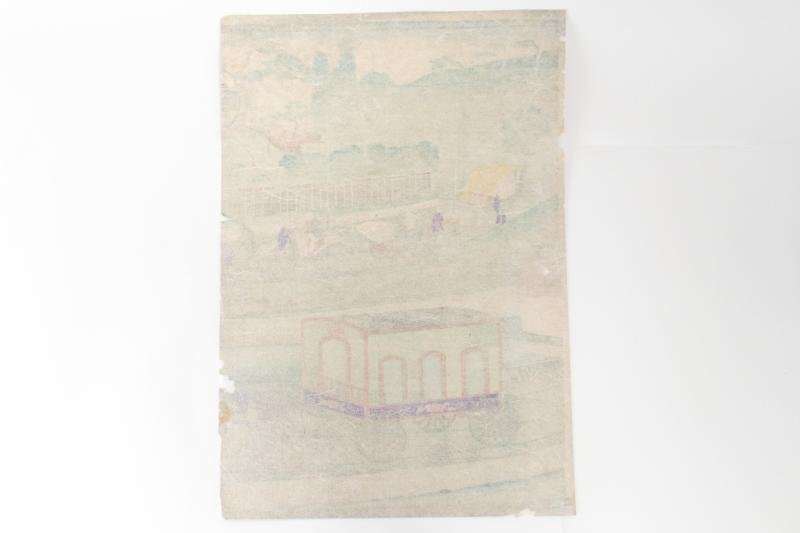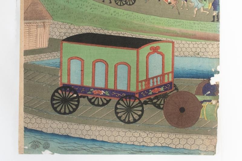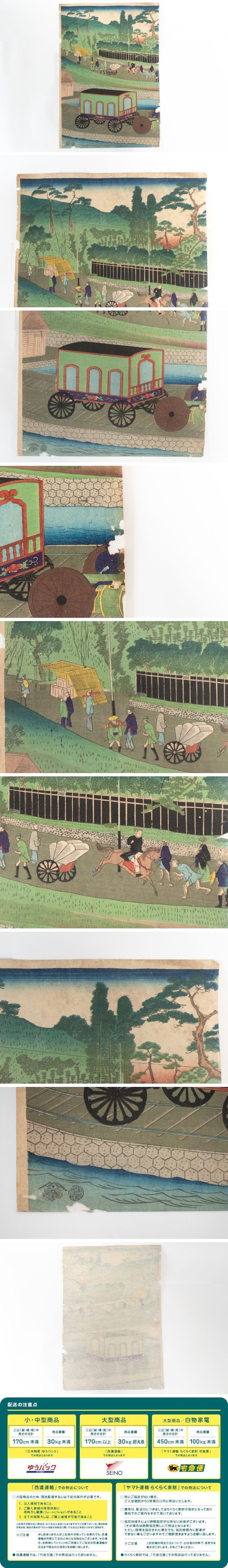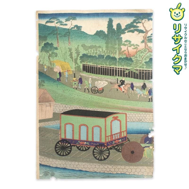【中古】M▽四代 歌川広重 高輪 貿易船荷卸蒸気車通行全図 1871年 木版画 風景画 開化絵 浮世絵 錦絵 大判 不揃い (K00753)
