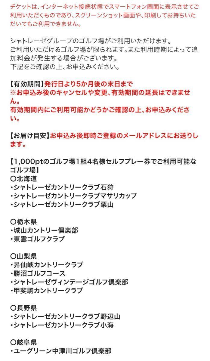 シャトレーゼ ゴルフ場 1組4名様 セルフプレー券 1000pt