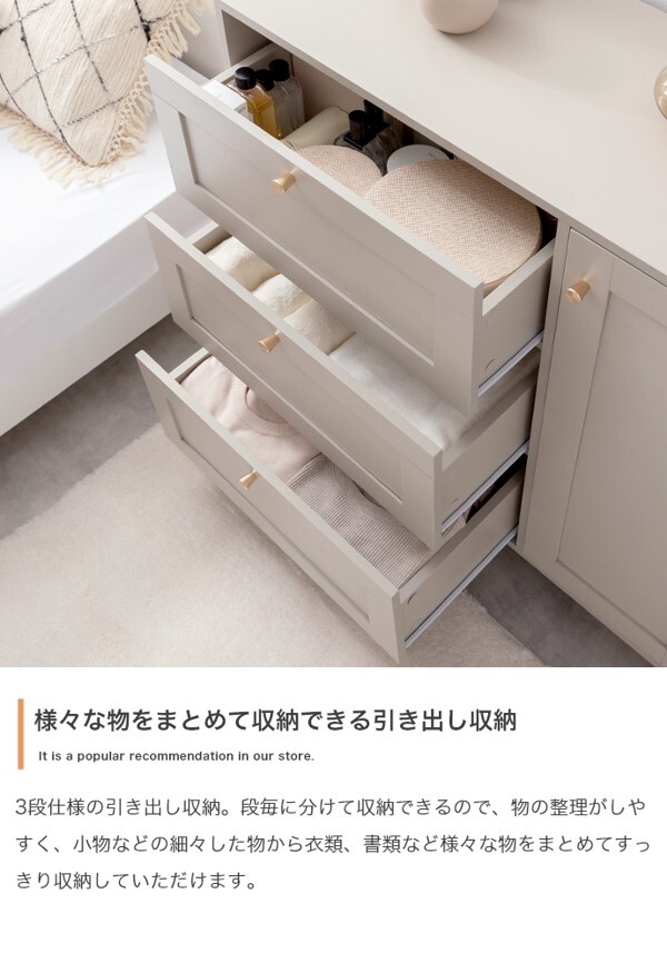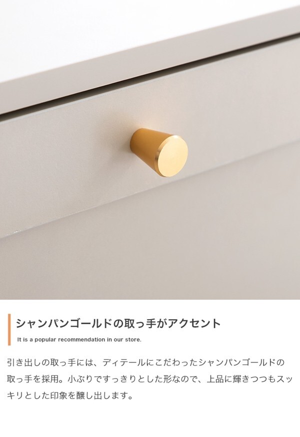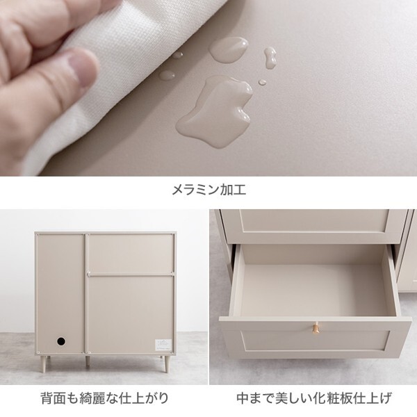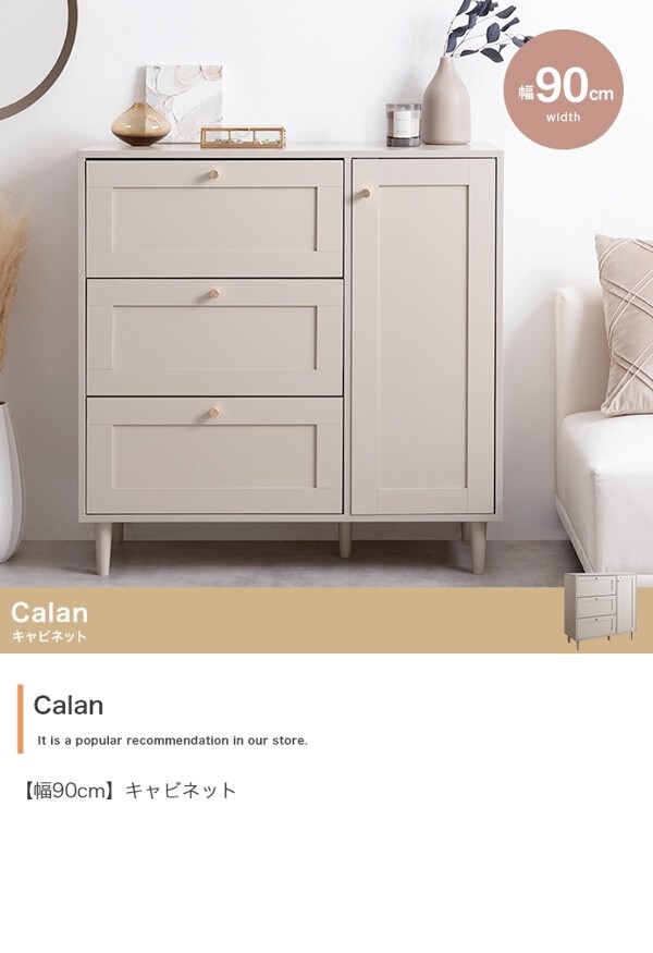 品のある框(かまち)デザインと柔らかなニュアンスカラーが印象的な『Calan(カラン)』シリーズのキャビネット。 シャンパンゴールドの取っ手と美しい框デザインがお部屋のアクセントとなり、感度の高い海外インテリアのような空間へと導きます。 柔らかなニュアンスカラーで甘すぎない大人な可愛さもプラスし、置くだけでお部屋をセンスアップさせることが可能です。 配達業者を指定いただくことはできません。 沖縄・離島に関しましては、別途配送料が必要となります。 北海道への配送も別途配送料が必要になる場合がございます。 ※別途送料が発生する場合は後ほどご連絡させていただきます。 タイミングによっては在庫切れの場合があります。