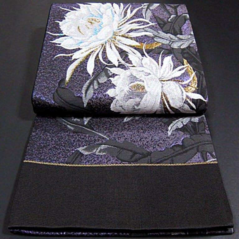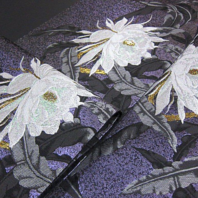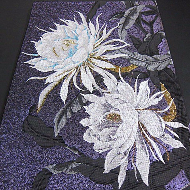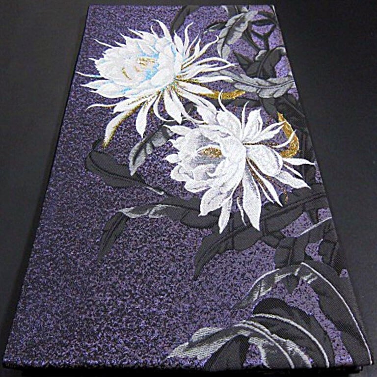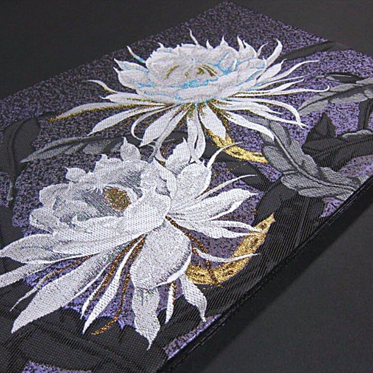新品未仕立 西陣織六通柄袋帯です。月下美人の花が豪華に織り上げた逸品です。月下美人の花言葉には「ただ一度会いたくて」「はかない美」「はかない恋」などがあります。月下美人は、夜になると、強く上品な香りとともに美しい花を咲かせ、ひとときの幻想的な景色を見せてくれます。大人女性の装いに相応しい一品。訪問着、色無地、付下げと、年齢を問わず、長くお使いいただけるかと思います