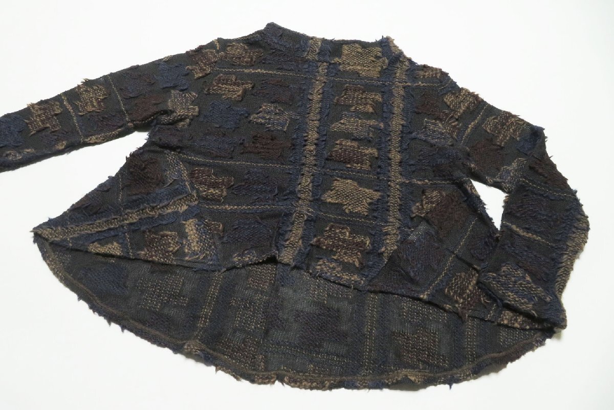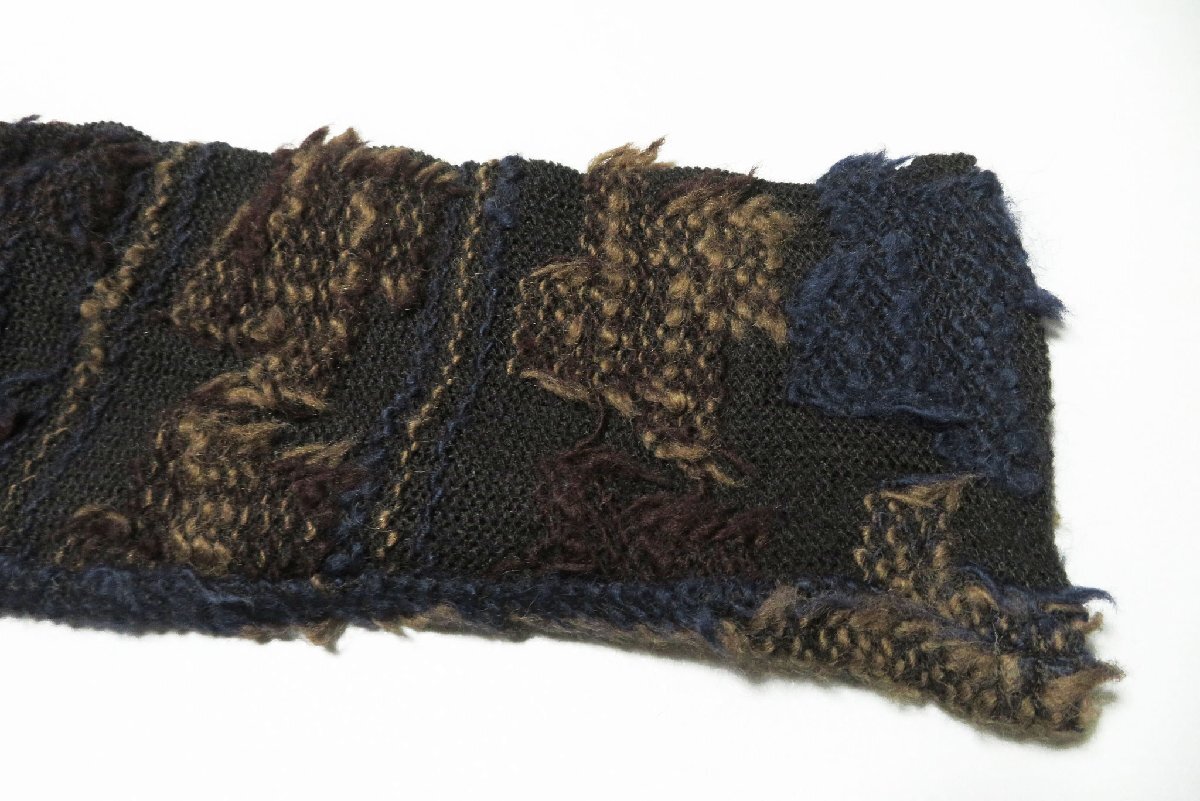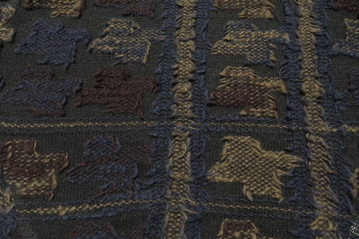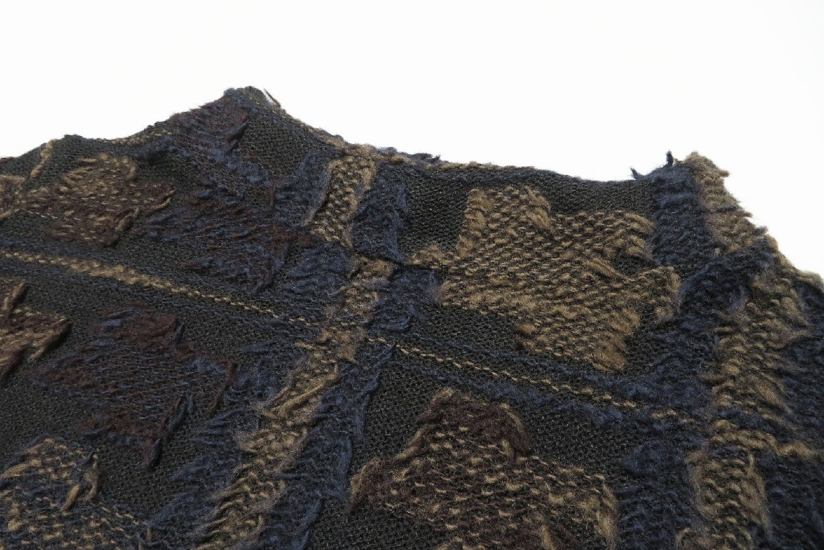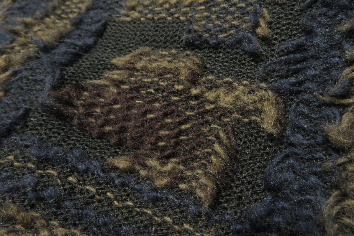 混合ウール素材で濃いブラウンやこげ茶、くすみ紺などの立体的な編み目のジャガード織りになります。
