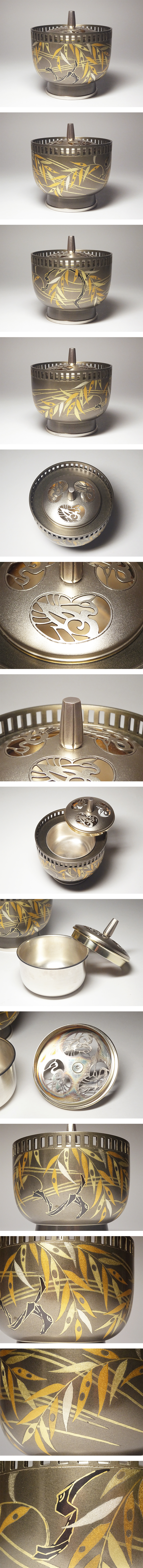 慶應◆人間国宝【鹿島一谷】秀逸作 『爽風』 布目象嵌柳文朧銀香炉 三鷺文透銀火舎 共箱・二重箱 88歳時の晩年作!