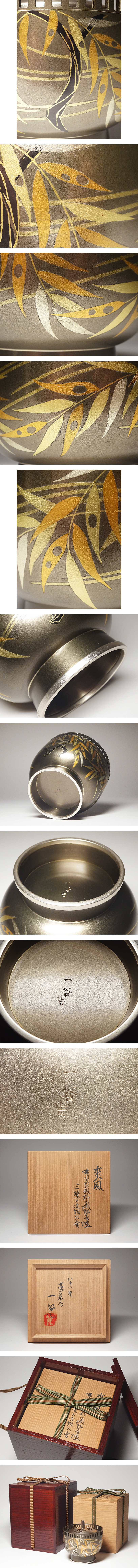 本物保証!         代々金工を家業とする家系の生まれで、祖父及び父に布目象嵌を、後藤一乗、関口一也、関口真也に彫金を師事。  初期は帝展や日展を中心に活動し日本工芸会の創立と共に日本伝統工芸展に活動の場を移行、重要文化財の復元修理等を多数担当し、1979年に「彫金」にて国重要無形文化財保持者(人間国宝)に認定された近代金工を代表する巨匠【鹿島一谷】(1898-1996)作。     『爽風』と銘打たれた、布目象嵌柳文朧銀香炉です。   三鷺文透銀火舎が添えられます。         朧銀(四分一)製の素地に、金、銀、赤銅、黄銅等の多彩な色金を用いた精緻な布目象嵌で柳図が表現された秀麗な作行きの一作。   強風によって揺れる柳の様子が見事に表現されております。   火舎は三方窓絵で鷺図透かしがされた銀製無垢の造りです。     作者88歳時(1986年から1987年)に制作された晩年作品で、同時期に日本伝統工芸展に出品されていた作品と比較しても遜色ない抜群の出来といえます。         底部に彫金銘。   共箱、漆塗り二重箱付き。         経年による多少の擦れ等見られますが、総じて目立つような傷みは無くとても良好な状態です。           正真正銘本物保証!