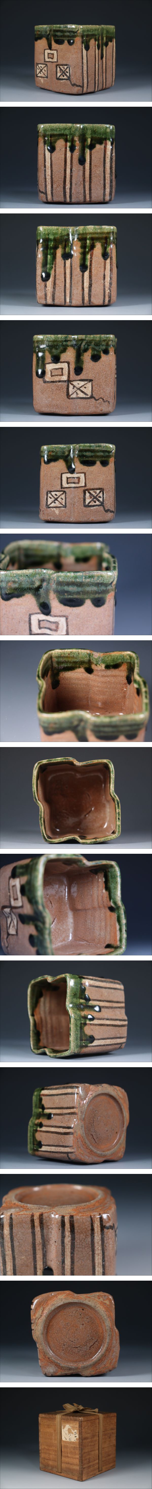 | 商品説明 | 商品名:蔵出し品 古織部 江戸初期 玉垂れ 四方向付 付属品:四方桟箱あり。 サイズ:高さ7,8cm、口径8,5cm、高台6cm。 状態:経過のスレがございます。 |