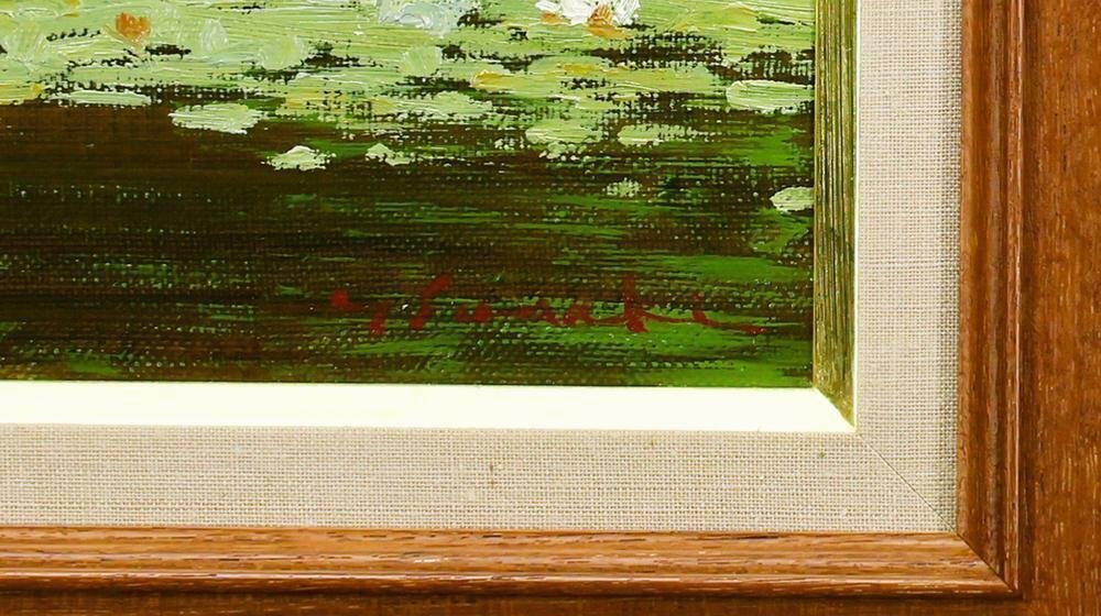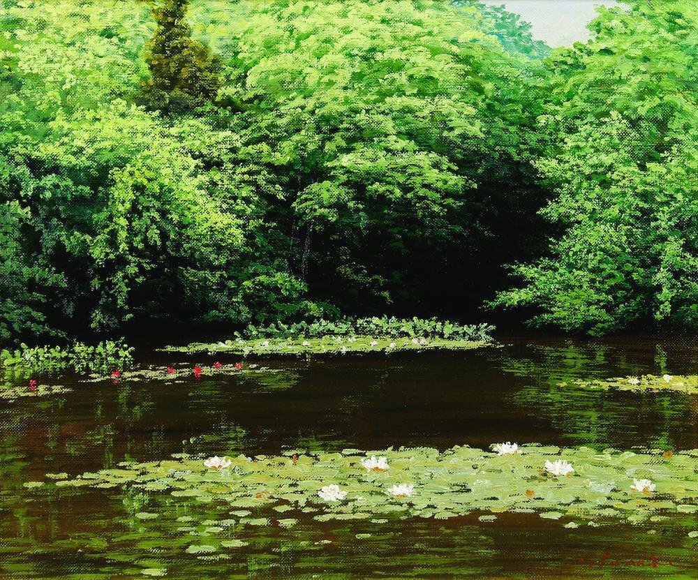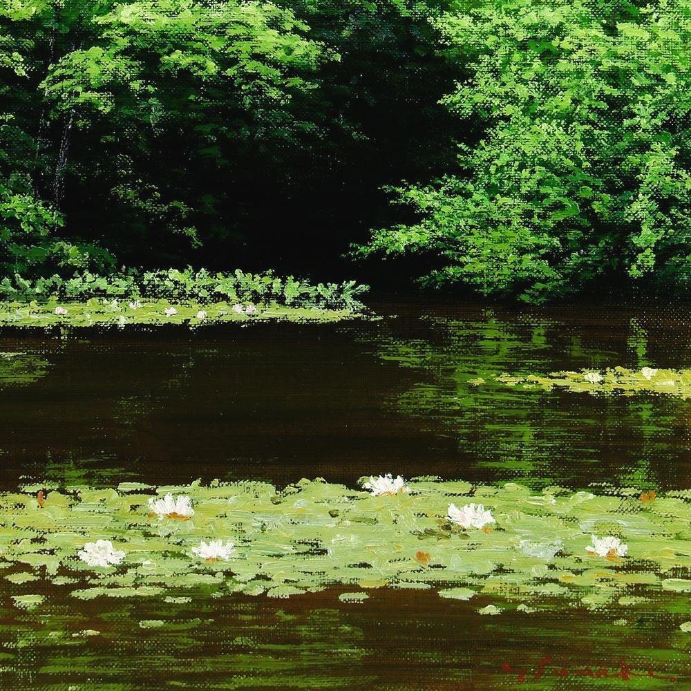 【真作】【WISH】佐々木友「睡蓮の森」油彩 8号 ◆水蓮の花・緑濃く包み込む癒やしの水辺  〇新日本美術協会員 師:中尾不二夫 #25122317