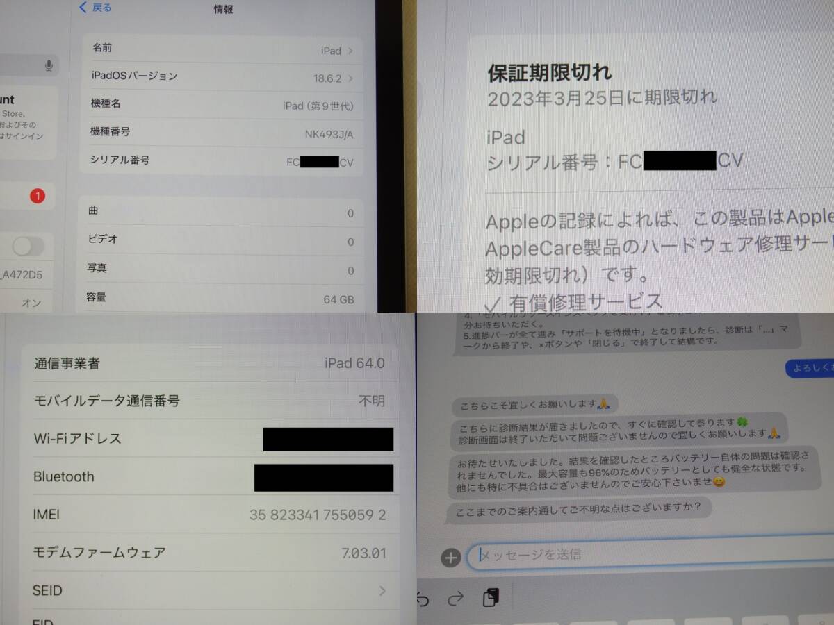 | 型番 | iPad A2604 NK493J/A(第9世代) |