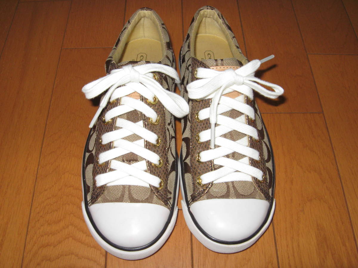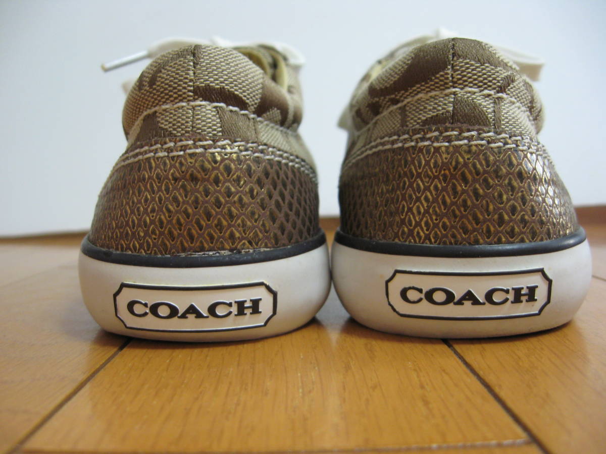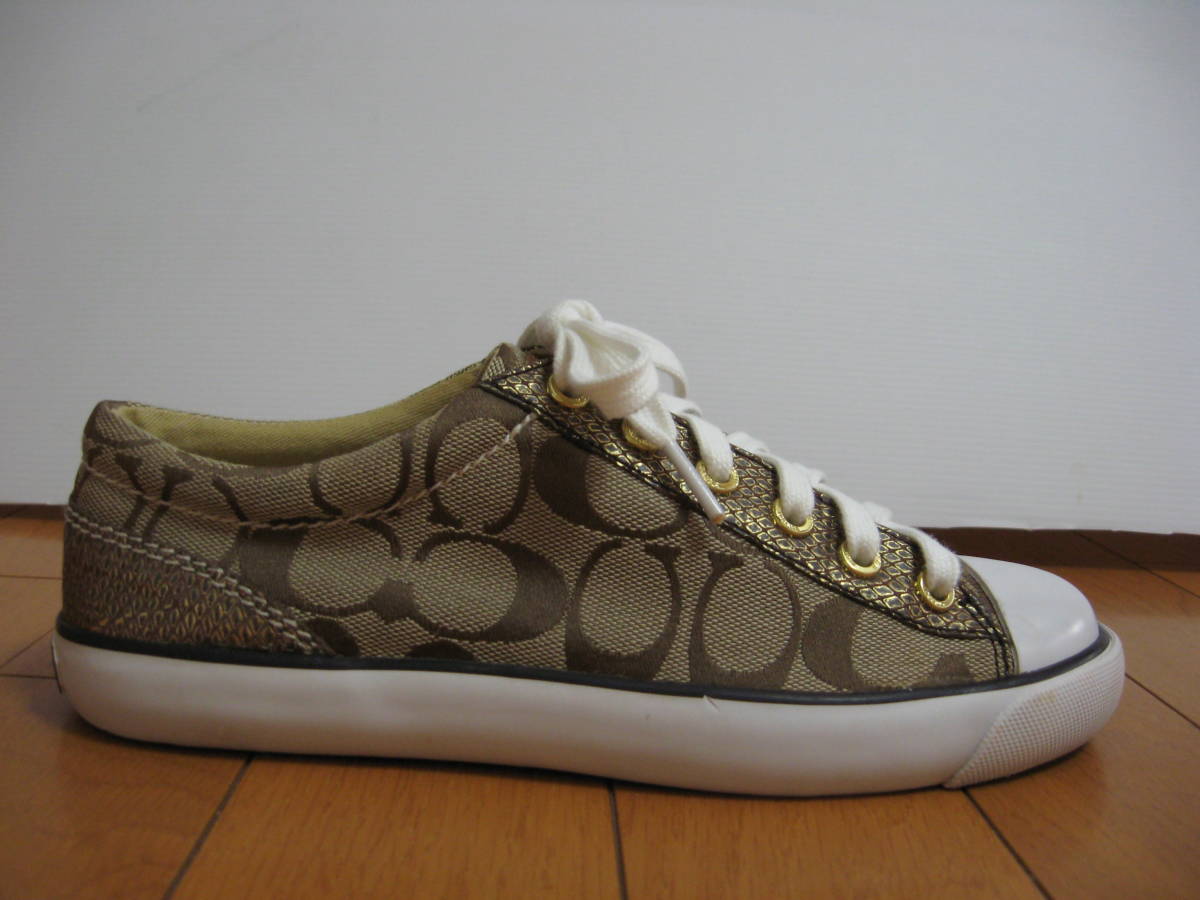 即決 コーチ COACH ローカットスニーカー 23.5cm ロゴ入りシグネチャース ベージュxゴールド
