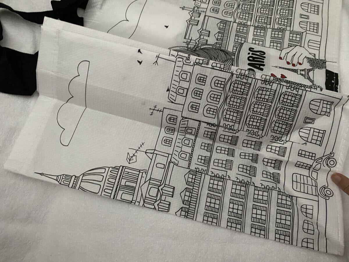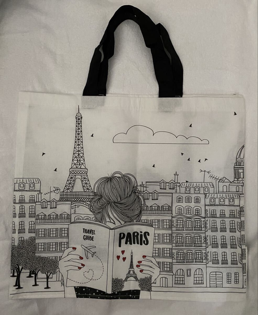 巴里(パリ)らしいエッフェル塔とアパルトマン建造物の前でトラベルガイドを見る彼女の景色が情感たっぷりに描かれた絵画の様に美しい大容量エコショッピングバッグ**