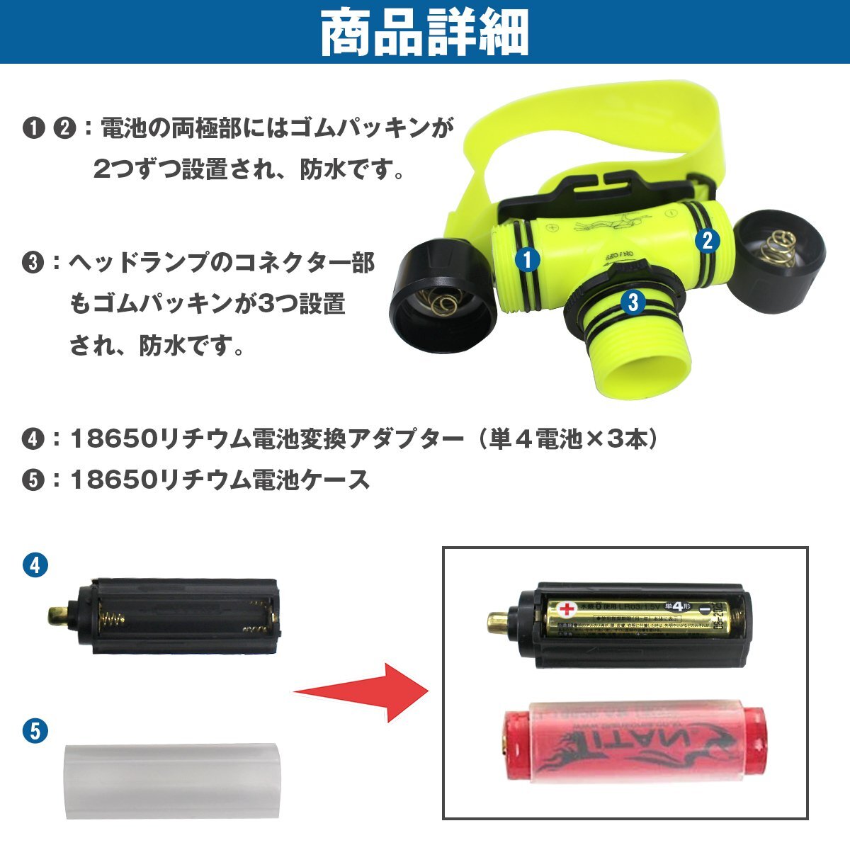 【新品即納】ダイビング LED ヘッドライト 防水 水深30m 3段階 ブラック 単4電池/18650対応 潜水ライト
