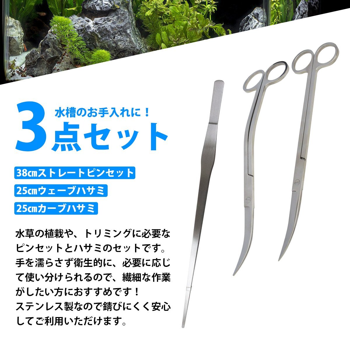 商 品 説 明水草の植栽やトリミングに必要なピンセットとハサミのセットです。