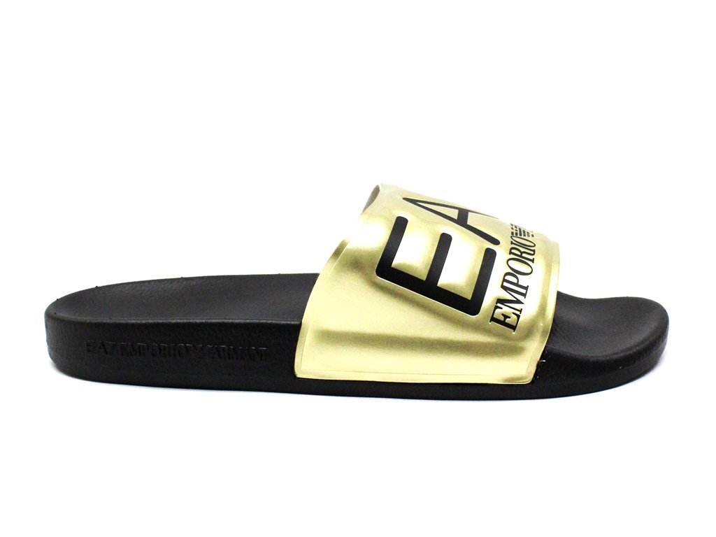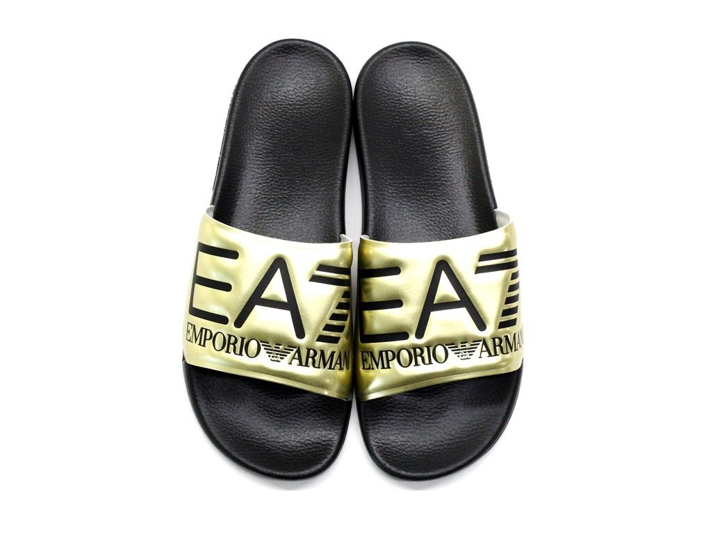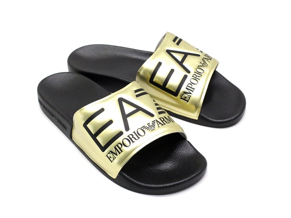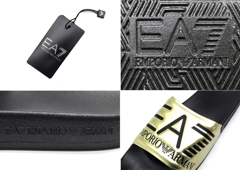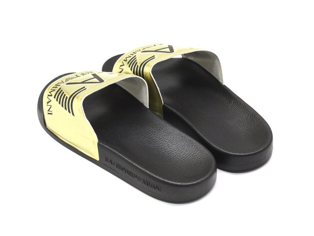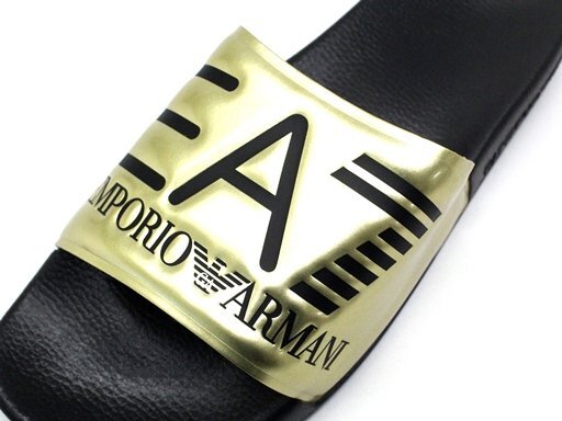 3万新品◆9H=28.5cm◆EMPORIOアルマーニ EA7 ロゴ入りスライドサンダルシューズ ゴールド×黒【ARMANI】