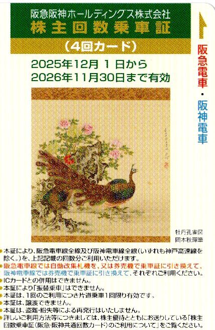 阪急阪神ホールディングス株主回数乗車証4回カード1枚売り。期限2026年11月30日。落札金額は1売りでの金額です。写真は1枚ですが1枚売りです。ノークレームノーリターンでお願いいたします。