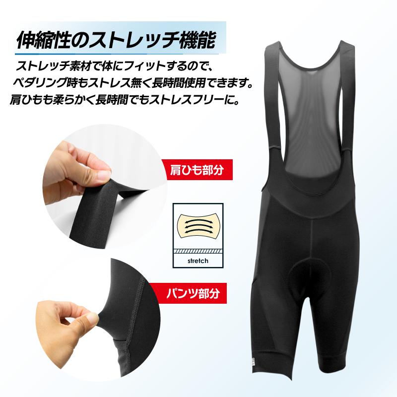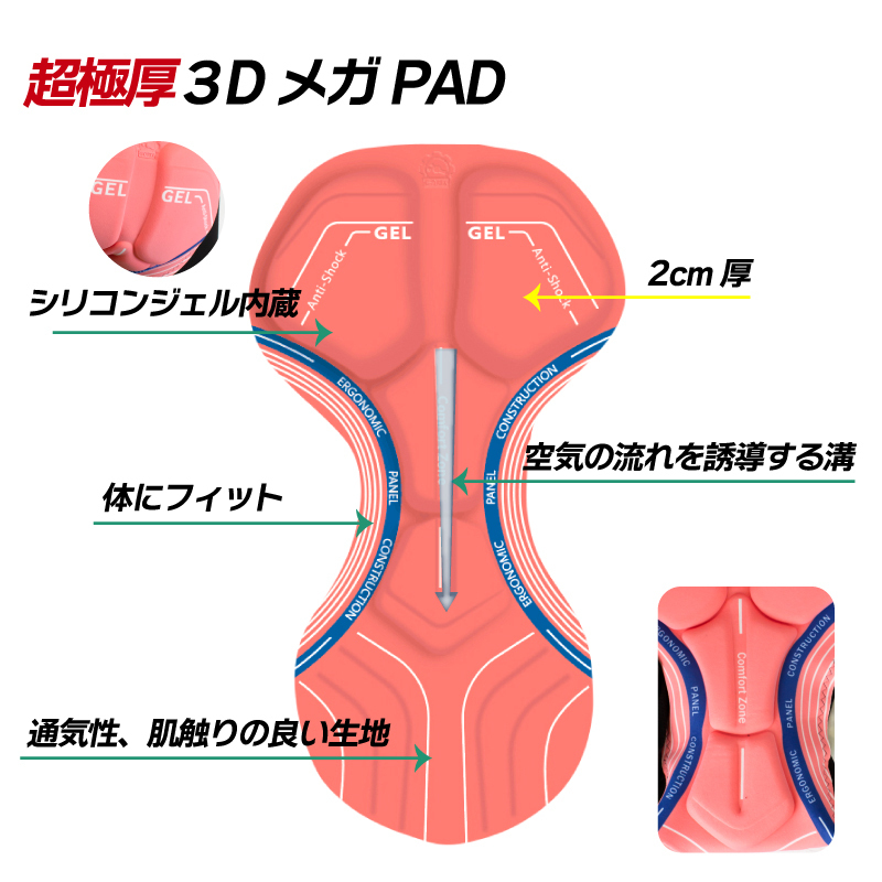 春・夏・秋のサイクリングに最適な万能サイクルビブパンツ。 サイドにメッシュのポケットが付きとても便利。 サドルとおしりの間に超極厚3Dメガパッドがある事によりお尻の痛みを軽減します。 ビブタイプの特徴でウエスト部分に締めつけがないので長時間快適です。 レースからロングライドまで幅広い用途に。 [両サイドにメッシュポケット] 補給食やスマホ、鍵などの小物を収納。 バッグなど持ち歩かない気軽なライドに便利です。 [超極厚パッド] 人体工学に基づき、お尻、会陰部に衝撃吸収の分厚い約2cmシリコンジェル内蔵パッドを配置 真ん中には空気の流れを誘導する溝デザイン 両側の溝は人体構造に合わせたフィット感でペダリングの邪魔にならない。 [お尻の痛みを軽減] サドルの上に長時間座り走り続けるとお尻や股間が圧迫されて痛みがでて辛い。 楽しいはずのサイクリングも残念な気持ちに。 超極厚3Dメガパッドでこれらの症状を起こりにくくします。 [フィットする裾] 幅広で薄い生地なので優しくフィットします。 伸縮性があるので締め付けも軽減。 [通気性] 背中部分はメッシュ素材で通気性が向上し速乾性にも優れています。 熱籠りで暑苦しい不快感もおこらない。 [ストレッチ機能] ストレッチ素材で体にフィットするので、ペダリング時もストレス無く長時間使用できます。 肩ひもも柔らかく長時間でもストレスフリーに。 [反射リフレクター] ビブパンツのサイドにリフレクターを採用。 夜間の走行を少しでも安全に。 リフレクターが無いより視認性がUPします。 | |