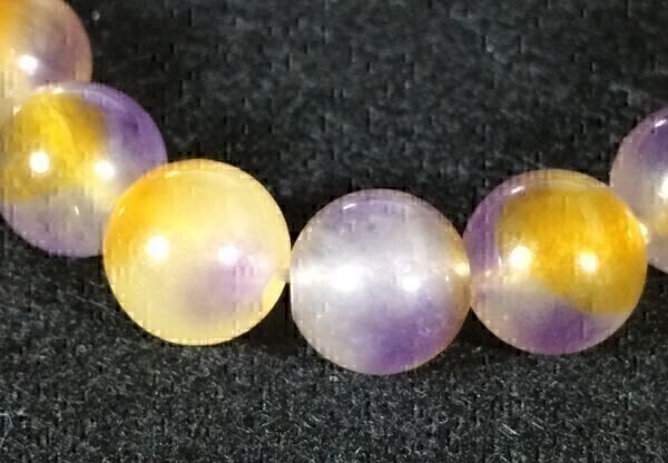 もともと多孔質の鉱物である瑪瑙の、とても小さな穴に微量の元素が混入して、このような色合いが生まれます。写真ではやや明るく映りすぎていますが、実物は白バックの写真のように、もう少し落ち着きのある色合いです。高貴な紫、落ち着いた山吹色が魅力的です。
