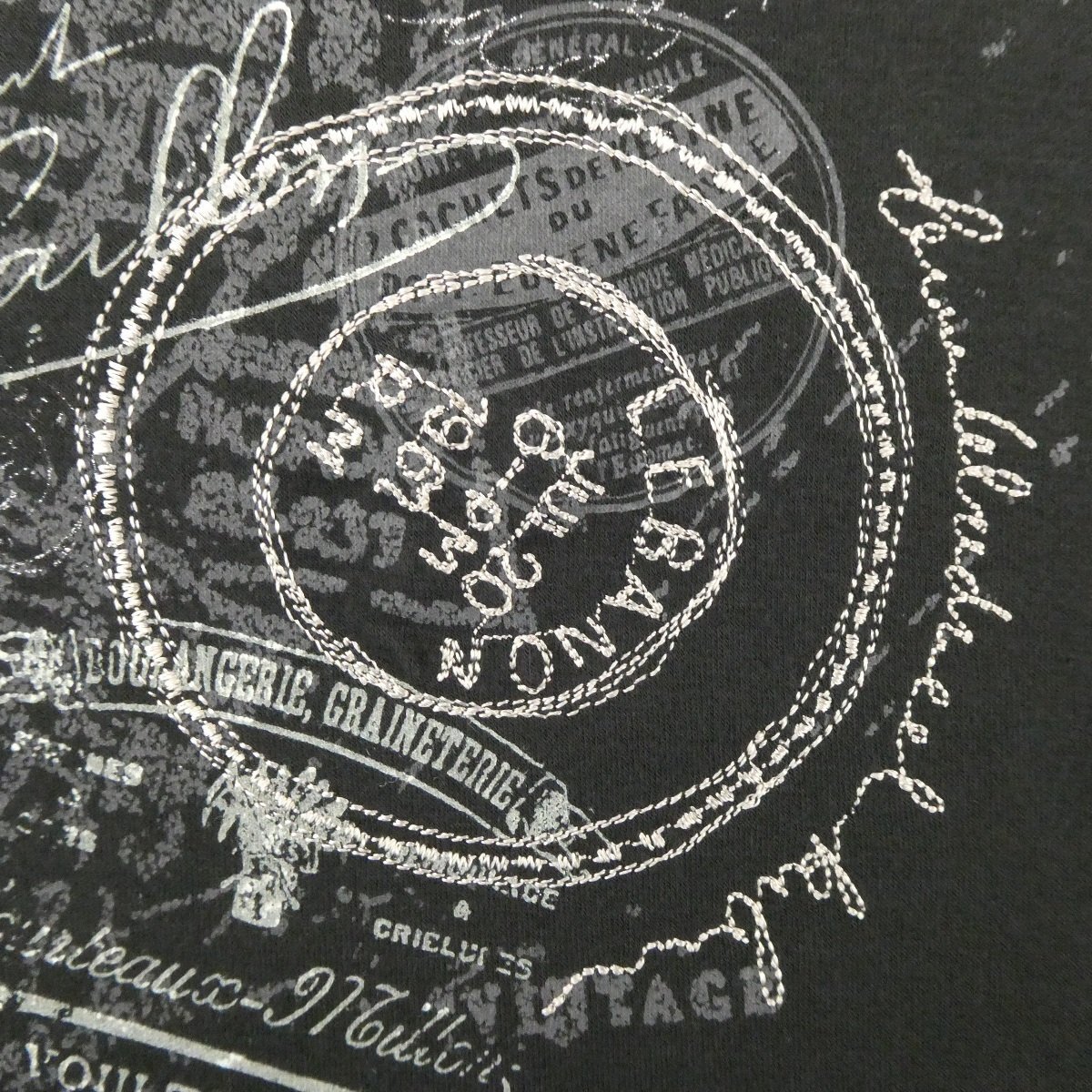 胸元には、ビンテージ感のあるスタンプや文字盤のようなモチーフが散りばめられた繊細なプリントが施されており、カジュアルながらも大人の遊び心を感じさせるデザインです。