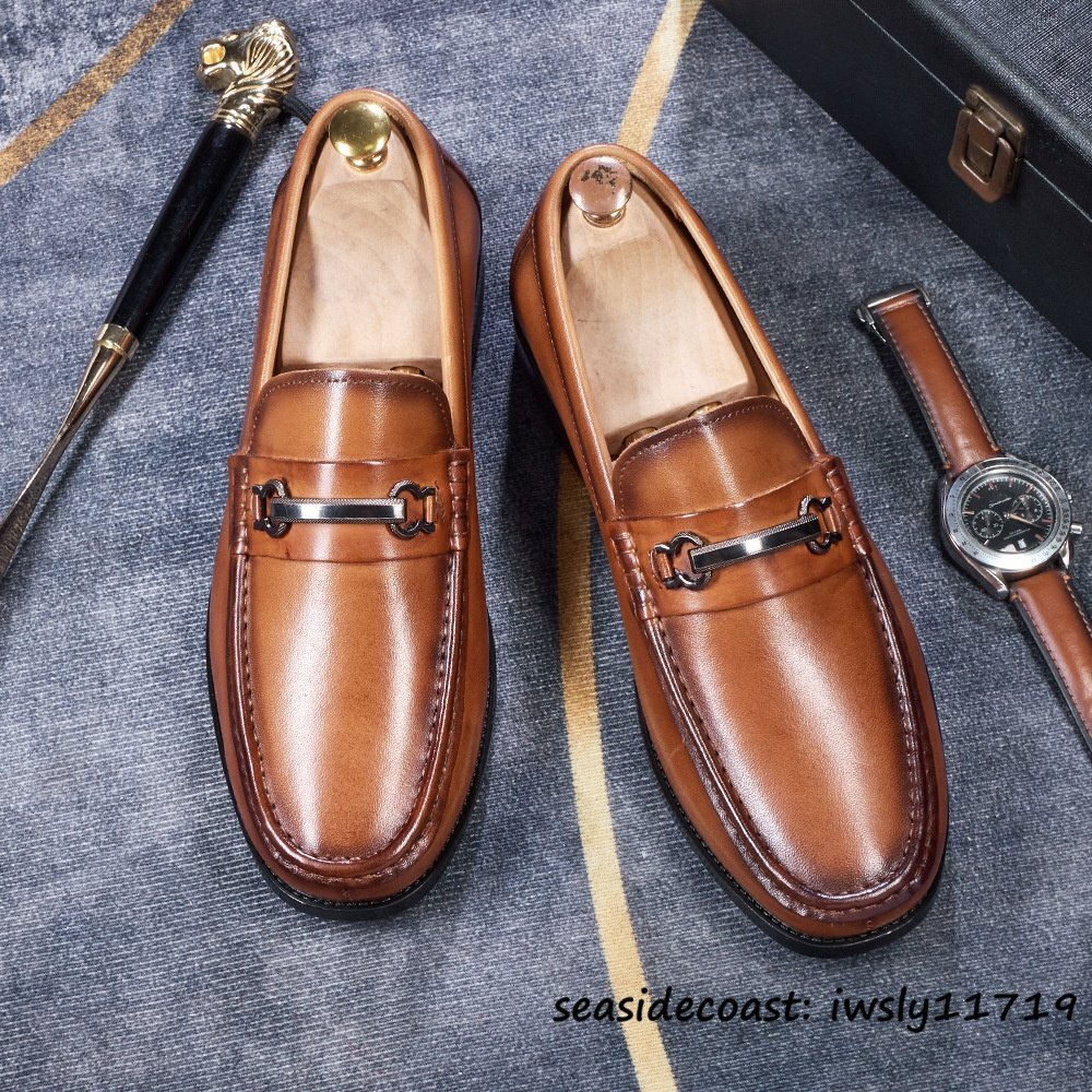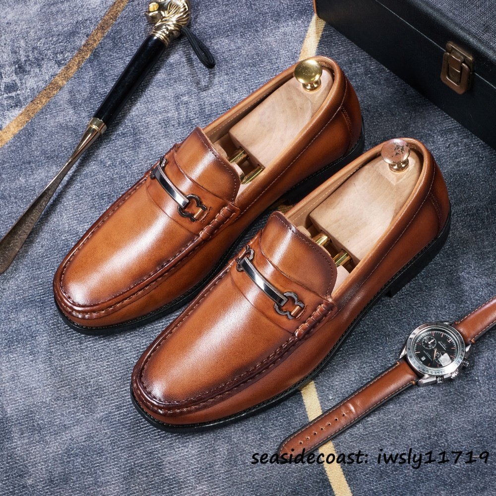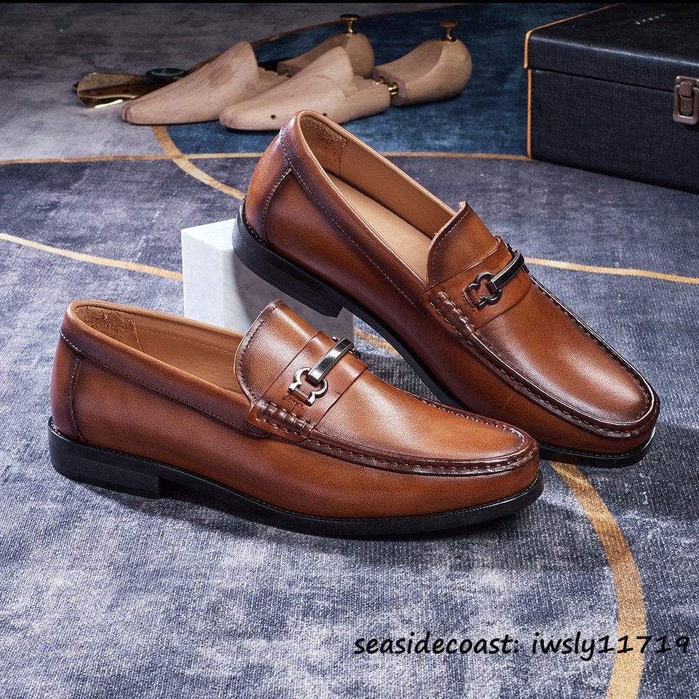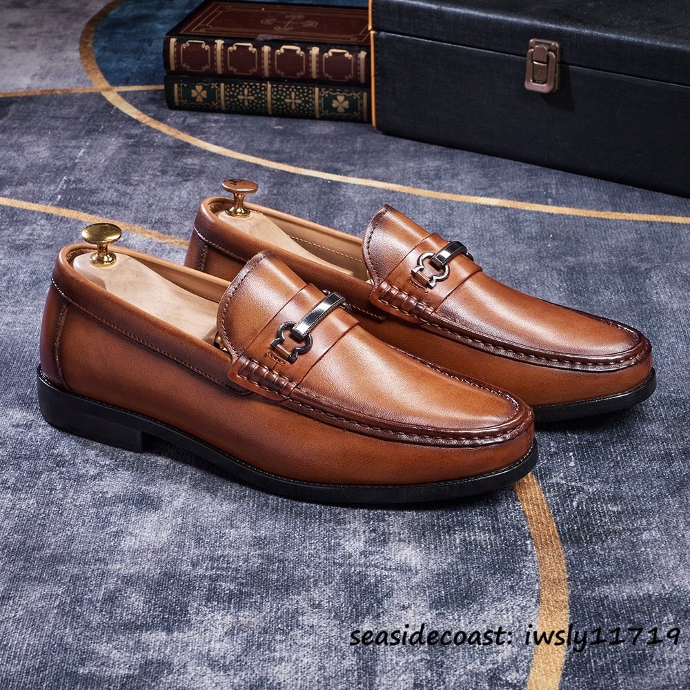 入手困難*メンズ 本革 スリッポン ビットローファー 職人手作り 牛革 レザーシューズ 革靴 紳士靴 ビジネスシューズ 通勤 ブラウン 25.0cm