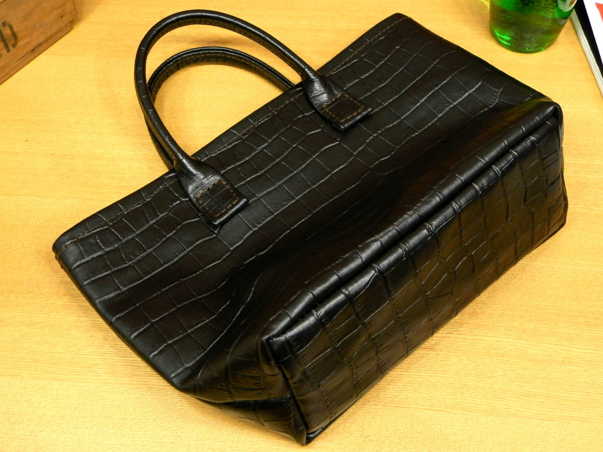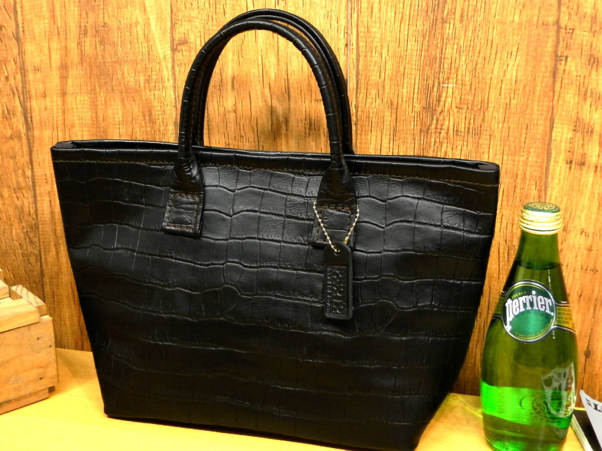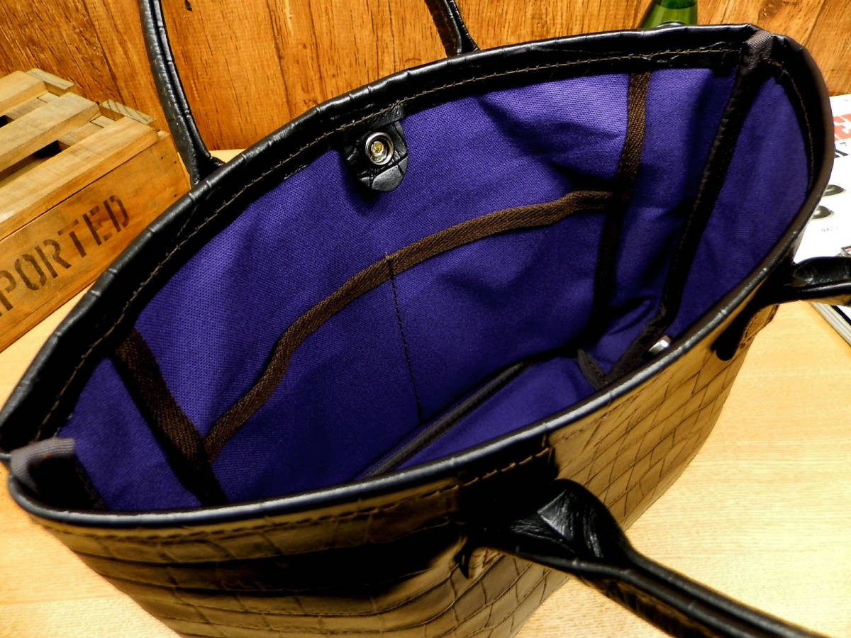 ☆上品パープル裏地カスタム☆迫力のクロコ型押レザー小型トートバッグ!日本製ブラック黒ミニトート龍野レザー黒ブラック×紫 牛革