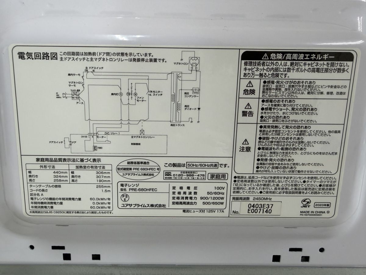 ▲営AD294-140 YUASA PRIMUS ユアサ プライムス 電子レンジ / PRE-680HFEC / 2023年製 / ホワイト / ターンテーブル / 動作確認済み / o