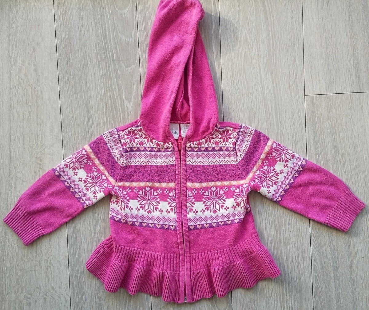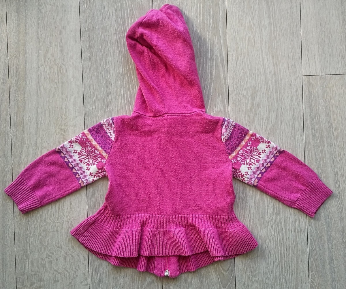 フード付きの可愛いピンクのトレーナー、雪の結晶柄とフリル裾が特徴。