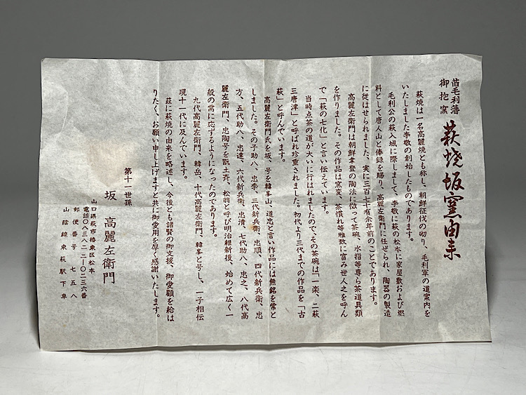 第十一世孫 坂高麗左衛門作 萩焼 湯呑 共箱 栞 ◆商品詳細 寸法(約):10.1x8.6x7.5(高×幅×口径cm) ※寸法に若干の誤差が生じる場合もございます。 少し汚れがありますので、 ご承知の上入札お願いします。 状態等画像にてご確認の上ご入札よろしくお願いいたします。 ◆発送先等のご連絡とお支払いについて ※発送先等のご連絡 落札時から48時間以内にお願い致します。 ※お支払 かんたん決済の期限内にお願い致します。 複数点落札時にまとめて取引の場合(72時間内)に、 まとめて取引の取引手順(落札者方の操作)を参考にお願い致します。 梱包したサイズを測って、地方によって送料を決めますので、よろしくお願いします。 ◆掲載画像について ※画像は現物を撮影しておりますが、照度、遮光、モニターによっては実物と 色目が異なって見えることがありますのでご注意ください。掲載画像では確認 できない傷や汚れがある可能性もございます、あくまで 中古品であるということをご承知の上、御入札をお願い致します。 ◆補償について 商品到着後はすぐに状態の確認をお願い致します。 商品の破損等がございまし たら、箱や梱包材など全てそのままの状態で保存し、お早めにご連絡ください。 (到着日から一週間以上経過、梱包材の廃棄済み等の場合、保証は致しかねます のでご注意ください。) ◆返品について 思っていたイメージと違う、などのお客様主観による返品はお受けできません ので、予めご了承ください。ノークレーム、ノーリターンでお願いします。届 いた商品が商品説明と著しく異なる場合(寸法、キズ記載ミスなど)のみ承り ます。早めにご連絡ください。 ◆注意事項 当方の希望価格と隔たりがある場合は、終了前にやむなく取下げさせて頂く場 合がございます。 ※商品ご落札翌日から4日間以内にご連絡が取れない場合は、入札取消の処置を 取らさせていただく場合がございます。 ※評価の悪い方は取り消す場合がございます。 ※原則として当方の不備以外のキャンセル・返品・返金は受け付けておりません。 以上の点を予めご了承頂いた上で、入札・落札お願い致します。 ◆発送方法 ▼ゆうパック(補償あり/追跡あり) 梱包後のサイズ:~約60cm ※送料全国一律880円 (但し北海道、沖縄、離島は+500円いただきます。) 発送元は静岡県となります。 ( 商品の組み合わせによっては同梱をお断りさせていただく場合があります。) ※大型商品について 郵便局の規定を超える商品の場合は、佐川急便またはヤマトでの発送となります。 |