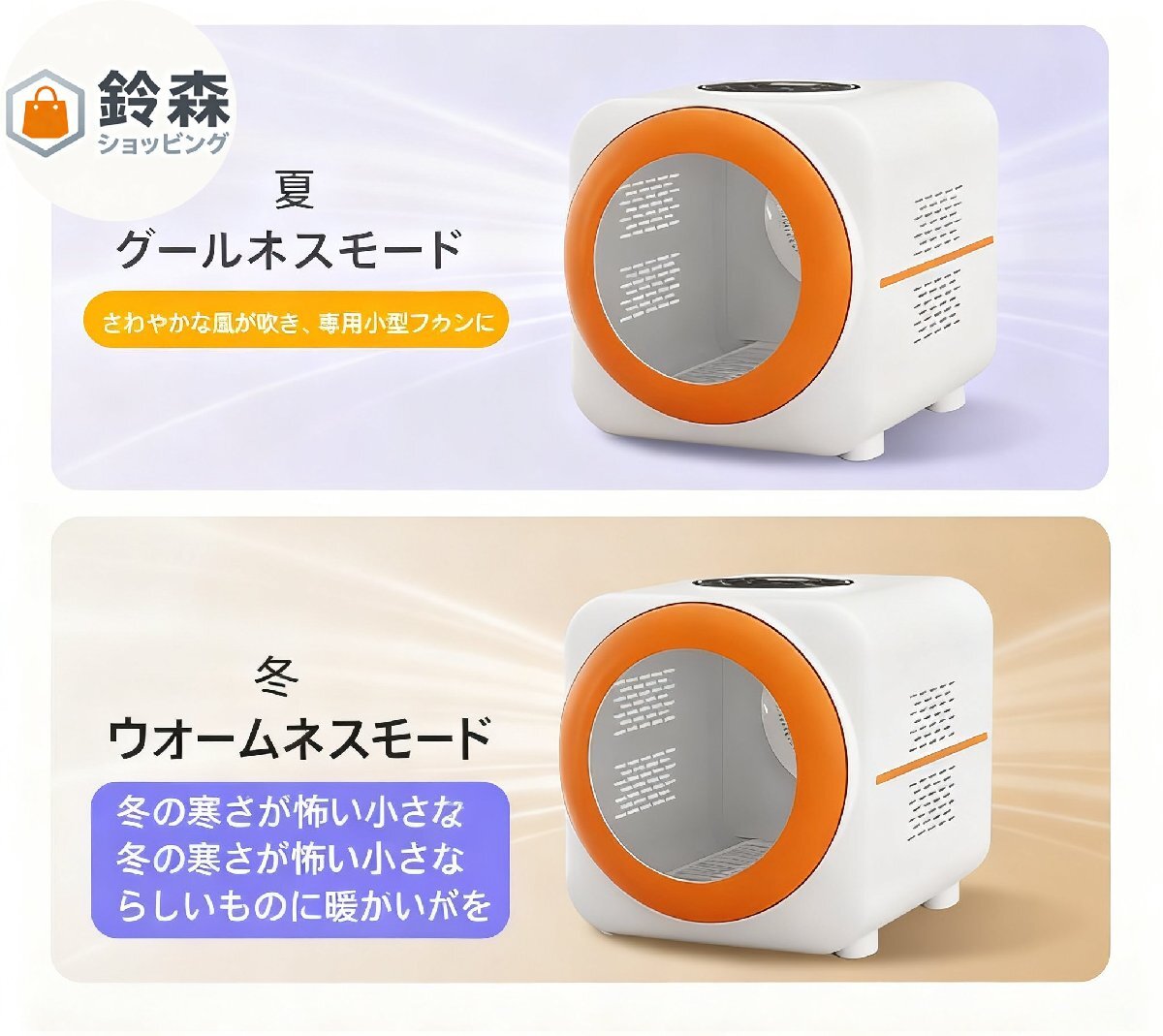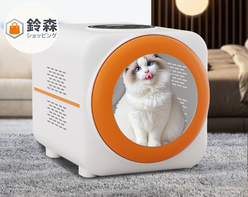 ◆03お部屋みたいにくつろげる 長方形の小さなお部屋のような形状で、ペットは中で自由自在に遊び、くつろいでいるあいだに乾きます。 まずは風を使わず、お部屋に慣れてもらうところからスタート♪ 隅々まで風が行き渡り、毛並みが完璧に乾きます 風を循環させることで全身に風が行きわたり、乾かしづらいお腹や協下、しっぽなどもしっかり乾かすことができます。後ろから温風を吹き込み、空気を360度循環させ、ペットの毛並みを短時間で徹底的にケアします。 ペットに優しい、静かな運転音 騒音はわずか80デシベル、「人が小声でしゃべる」ぐらいの音量でペットが怖がらずに乾燥できます! 静かで臆病なペットや音に敏感なペットにも、安心して使用できます。 内部ライトで、いつでも中の様子が確認可能。 内部ライトが暗い場所でも明るく状態を確認できます。いつでもペットの安全を確保できます。