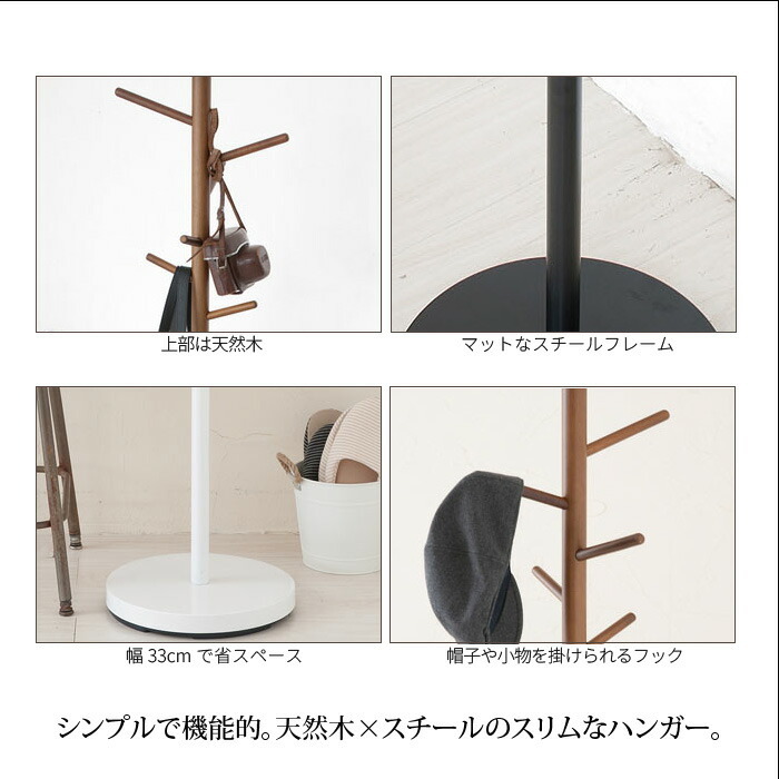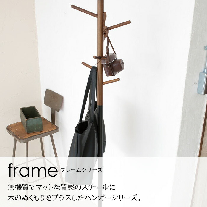| シンプルで機能的やフレームハンガーシリーズ。 無機質でマットな質感のスチールに木のぬくもりをプラスしたポールスタンド。 スチールは上品で艶のないマットな質感。 天然木と相性も良く、全体的に落ち着いた印象に。 ハンガー上部は木製仕様でフックの長さは2種類、各3本。 ブラックとホワイトの2カラー。 |
