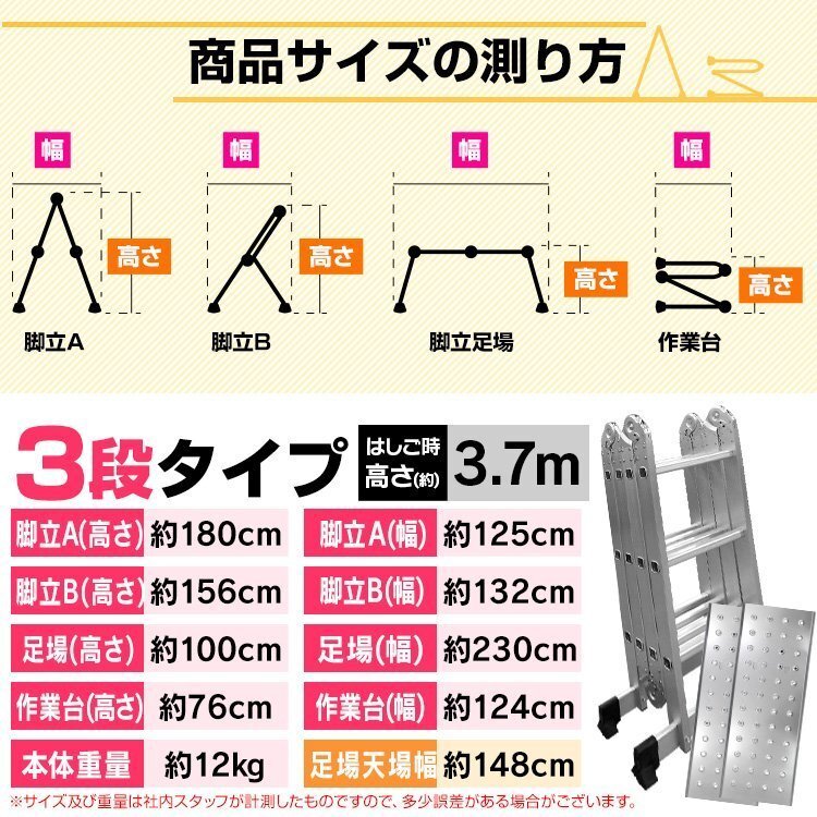 | 工事現場のプロも絶賛!! 多機能アルミ製はしごです。 多機能アルミ製はしごはこんな時に大活躍!! 植木のお手入れ、窓ふき、お掃除、工事、洗車、作業台など・・・ 組み方次第で様々なシーンに活用できる! 耐荷重100kgでとっても丈夫! ワンタッチ式ロック&調整付き! 安全・安心の横倒れ防止付き! アルミ製なので軽量、しかも小さく折り畳めるので車や倉庫に積みこみやすいです。 ■商品コード:A19C580 ■商品仕様 5段 プレート付きタイプ サイズ(約): ・折り畳み時:幅 38cm×奥行き 28cm×高さ 155cm ・ハシゴ時:高さ 約570cm ・脚立時:高さ 280cm ・足場時:幅 357cm 高さ 152cm 材質:アルミニウム、スチール 重量(約):16kg 耐荷重(約):150kg ステップ数:5段×4 ■注意事項 ・海外からの輸入製品のため、製造または配送の過程において生じた細かなキズやへこみが見られる場合がございますが、 機能性や品質上に問題はないため、返品や交換の対象とはなりません。 予めご了承の上、ご購入をお願いいたします。 ・商品を使用して発生した事故・トラブル・破損等につきましては一切の責任を負いかねます。 ・商品は、モニターによって色合いが異なって見える場合があります。 ・仕様・デザインは改良のため予告なく変更することがあります。 ■保障期間 7日間 ※商品到着後7日以内の初期不良・破損のみご対応させていただきます。 【もちろん新品未使用品です】 |