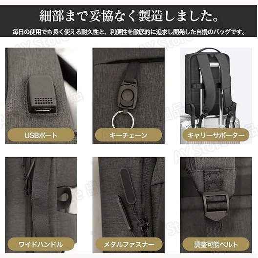 商品説明【優れた耐水性能を持つリュック】近年とくに増えてきた雨天。これからの時代のバッグには耐水性能が不可欠といえます。ビジネスリュック本体表面は高品質の防水生地が使用されており雨や水滴から荷物を守ってくれます。更に外装部分のサブポケットとメインポケットのファスナーはすべて止水ファスナーを採用したことで、より優れた耐水性能を兼ね備え、突然の雨に遭っても慌てない、内部のアイテムをちゃんと守る。また、バッグの表面が濡れてもさっと拭くだけのメンテナンスフリー。(※完全防水ではありません)