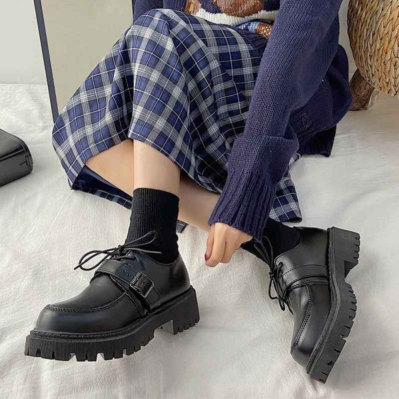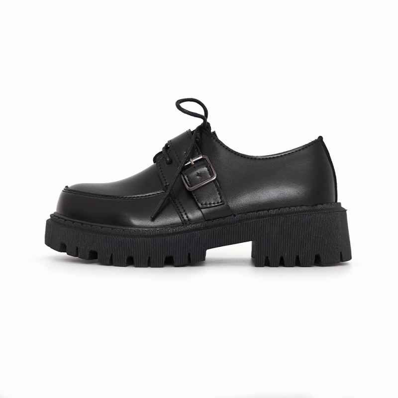 ローファー ドレスシューズ レディース 靴 合皮 厚底靴 編み上げ ローヒール 25.0cm(40) ブラック