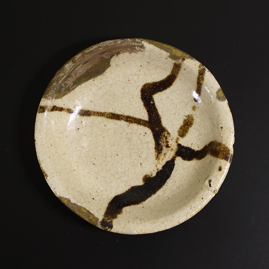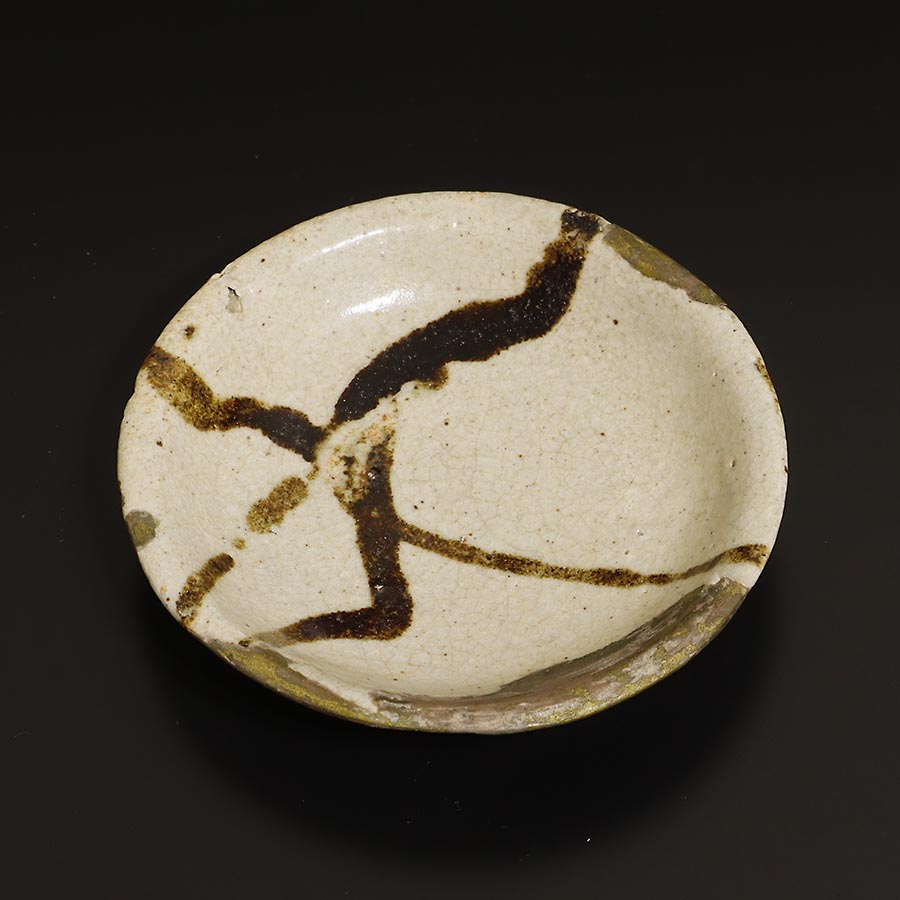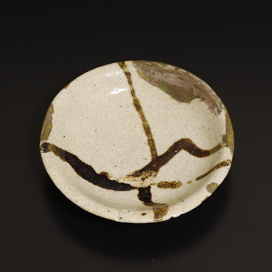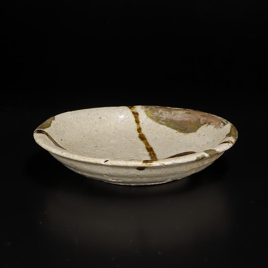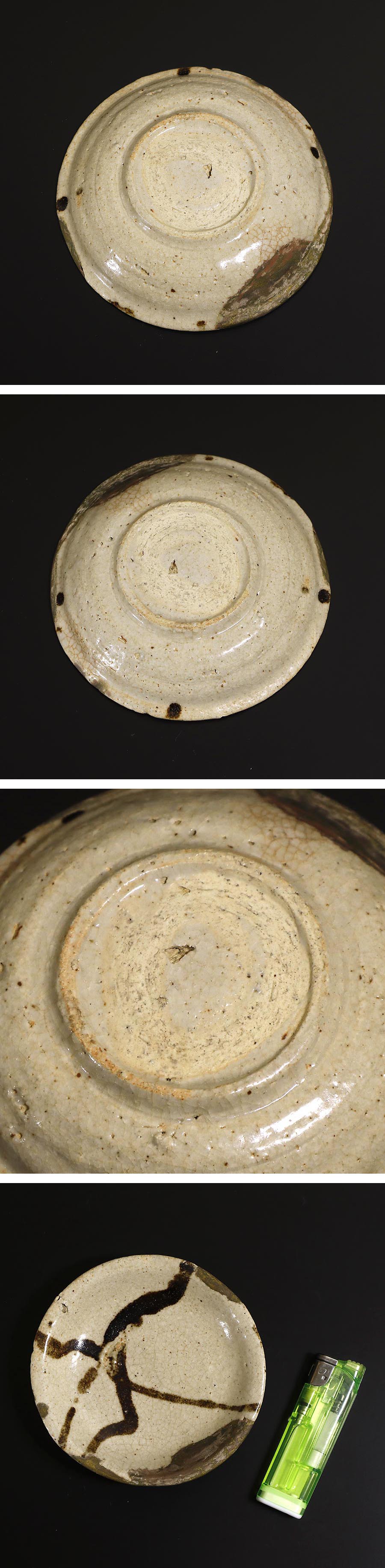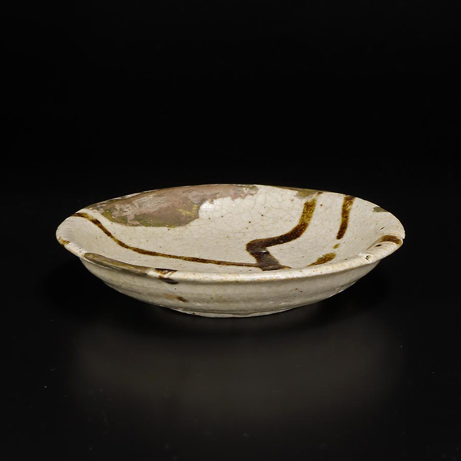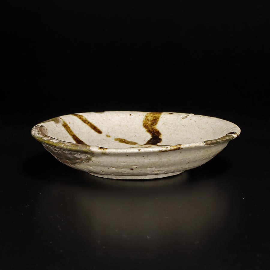 珍品です。流し掛けが施された志野織部皿。私自身初見の作例…同手品をご覧になったことのある方もほとんどいらっしゃらないことと思います。径11.2cm、高さ2.3cm。小皿としてはやや深さがあり、あるいは平盃としてもお使いいただけるようにも思います。