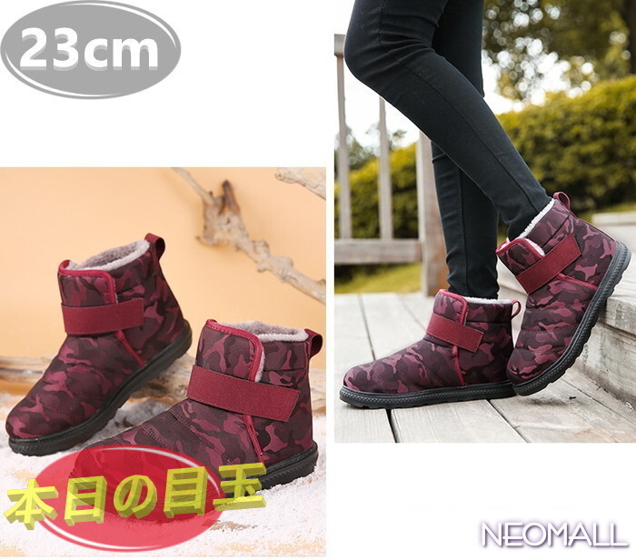 ユニセックス スノーシューズ 【870】 23.0cm 迷彩レッド ムートンブーツ スニーカー ウィンターブーツ 裏起毛 防水 防寒 防滑 冬用靴