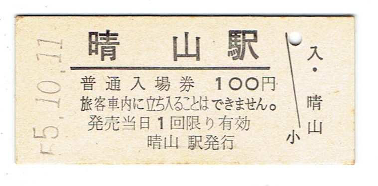 | 《硬券 入場券》晴山駅 昭和55年 | |