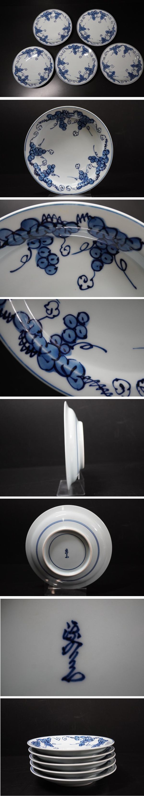 ご覧いただきありがとうございます。 館林源右衛門 古染風 葡萄絵 大皿 (19.8cm) 5枚 茶懐石です。 多少の擦れ等ありますが、美品です。