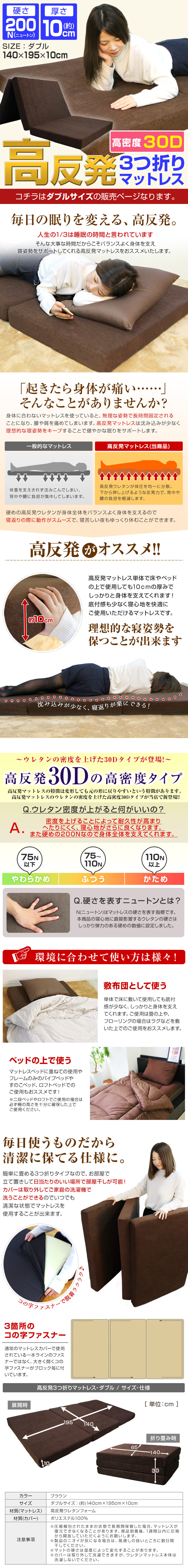 厚みたっぷり10cm! 適度な硬さで身体をしっかり支える、三つ折りタイプの高反発マットレスです。 柔らかいマットレスとは違い、身体の沈み込みを軽減した腰に優しい寝心地です。 高反発マットレスのウレタンフォームは弾性が高く、適度な硬さで身体を支えるので、底つき感もなくへたりにくいマットレスです。 寝返りが多い方や仰向けに寝ることが多い方におススメです。 簡単にたためる三つ折りタイプなので、お部屋で立て置きして日当たりのいい場所で部屋干しが可能! 取り外しやすいL字ファスナー付き洗えるカバーが付属しています! 【商品仕様】 【商品内容】 カラー:ブラウン サイズ(約):幅140cm×長さ195cm×厚み10cm(ダブルサイズ) 折り畳み時(約):幅97cm×長さ65cm×厚み30cm 素材:高反発ウレタン 、パイル生地 他 硬さ:200ニュートン 【注意事項】 耐熱仕様ではございませんので、電気毛布との併用はおやめください。 |