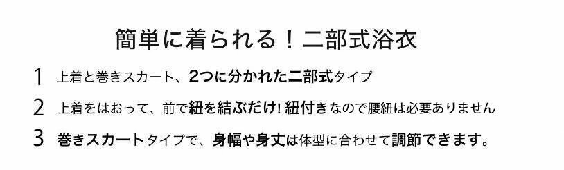 | 品質 | ・新品 ・仕立て上がり(すぐご着用できます) ★上着と巻スカートの2つに分かれ簡単に着られる二部式浴衣です。 ★上着をはおって、前で紐を結ぶだけなので(紐付き)腰紐は必要ありません。 ・綿100% ※当店では、現物と写真画像の色、イメージに相違がないよう撮影に工夫を凝らしておりますが、より詳しいお色説明をご希望のお客様は 「ヤフー設置の質問」「メール(aji_net@khaki.plala.or.jp)」「お電話」「FAX」にて、御質問ください。 |
