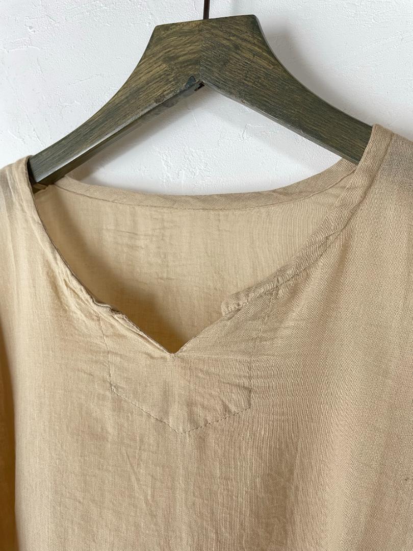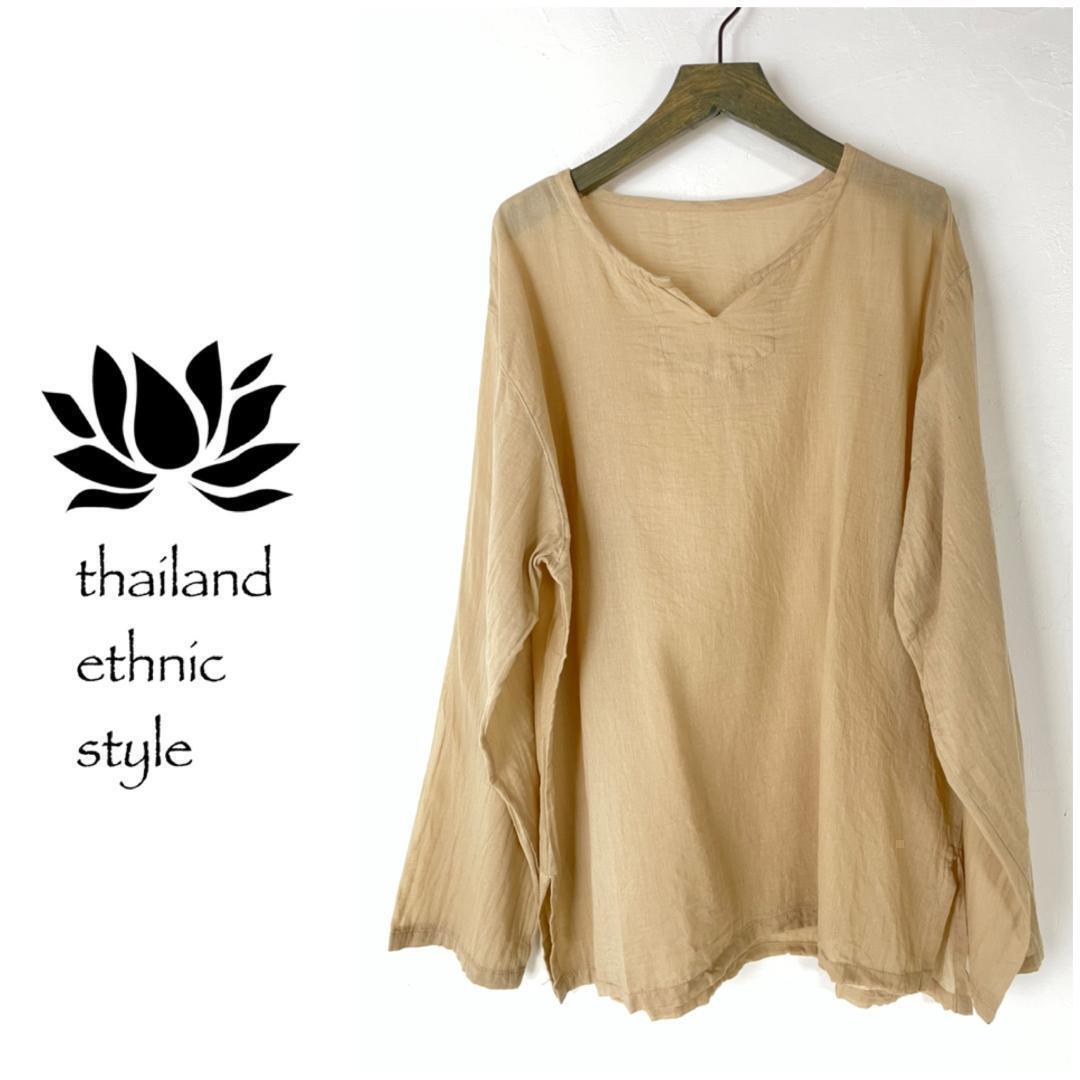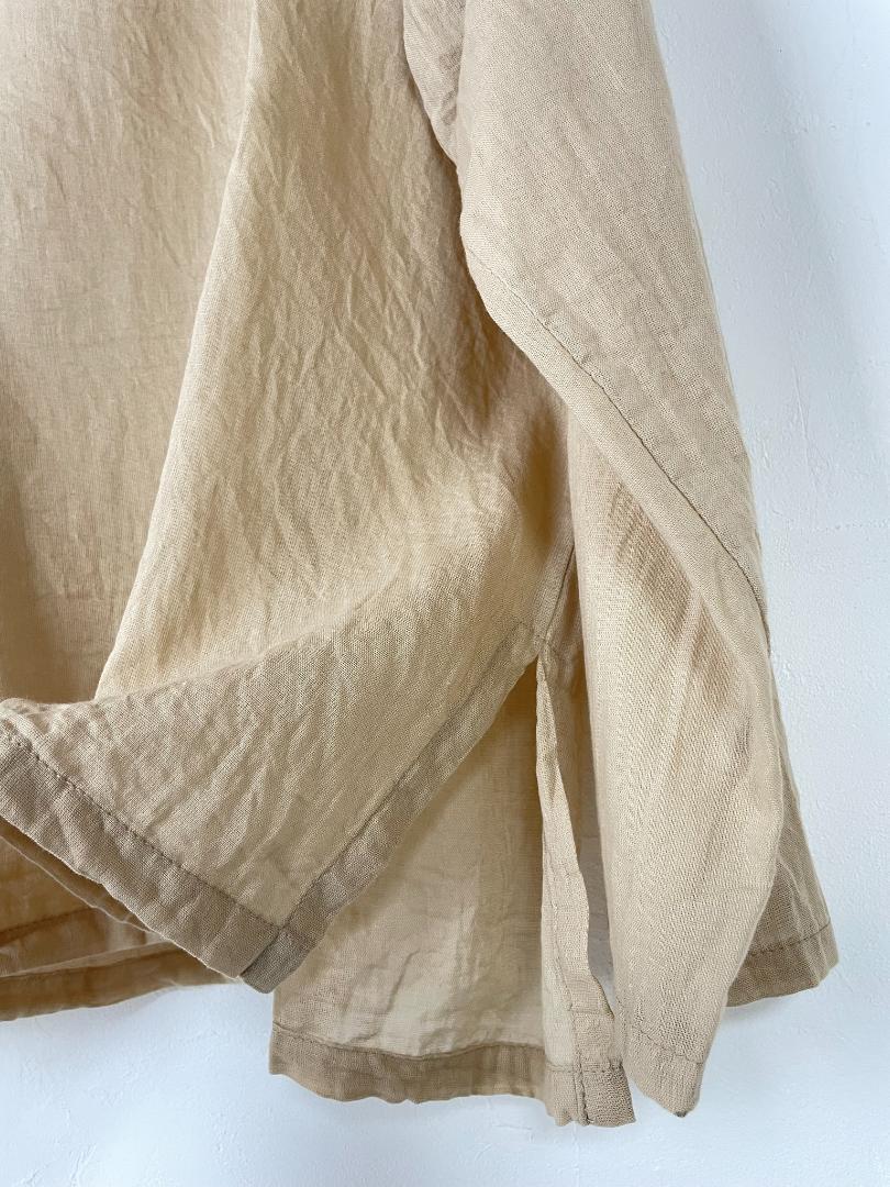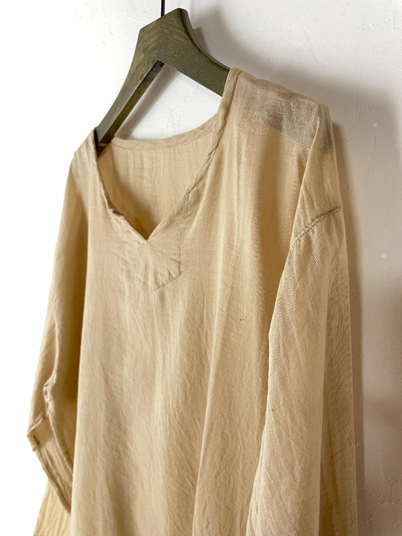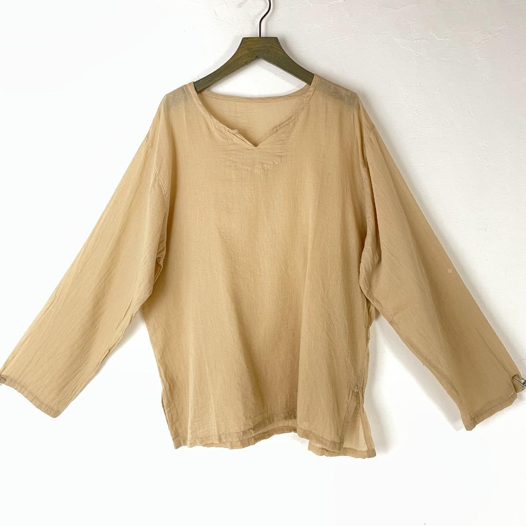 長袖ですがサラサラな風通しのよいシアーコットン。春夏〜秋用です。
