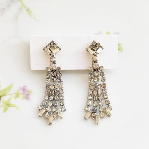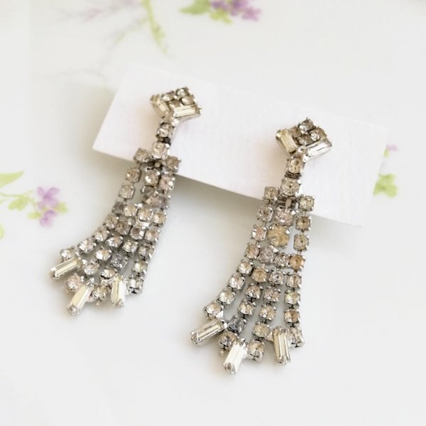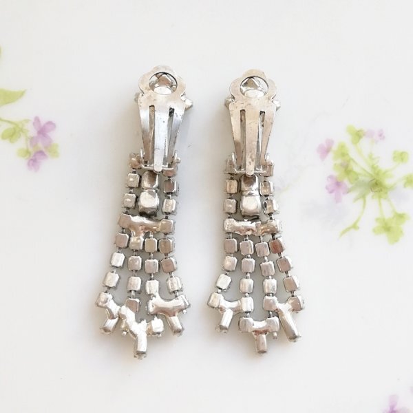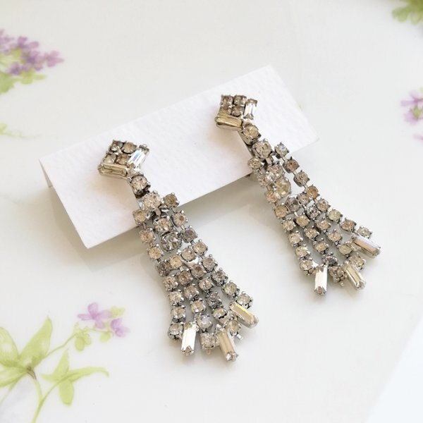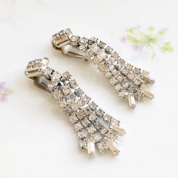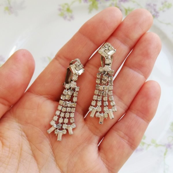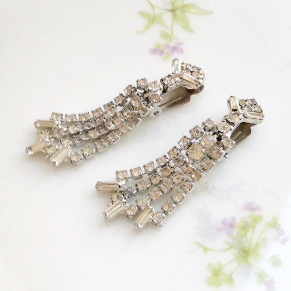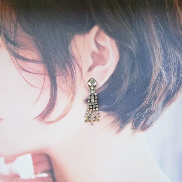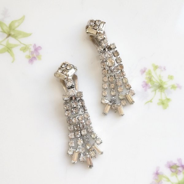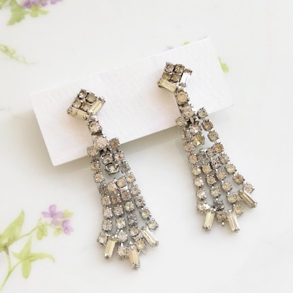 クリアラインストーンのイヤリングです。 キラキラと輝くラインストーンが耳もとで揺れてとても綺麗です。 クリップオンタイプのイヤリングです。 経年の為、小キズやスレが見られます。 ラインストーンに多少のかげりが見られるものがあります。 ■ブランド: Unsigned ■刻印: なし ■年代(推定): 1960-70年代頃 ■輸入国: イギリス ■サイズ: 約5cm x 1.6cm ■重量: 約4g(片方) アンティーク・ヴィンテージ商品には、経年による傷や劣化などがあります。 目立つものはアイテムの詳細に記載しておりますが、説明以外にもキズや損傷などがある場合がございます。 古いものですので、ご理解いただける方のみご入札下さいませ。 他サイトでも販売しておりますので、同時にご注文があった場合は、品切れの場合もあります。その場合は、大変申し訳ございませんが、ご注文をキャンセルとさせて頂きます事をご了承くださいます様お願いいたします。 | |||