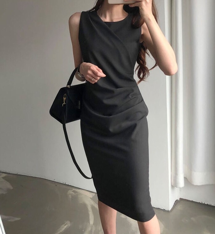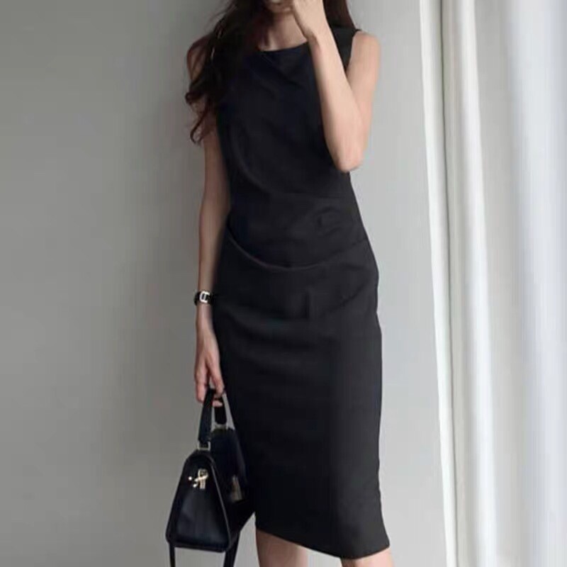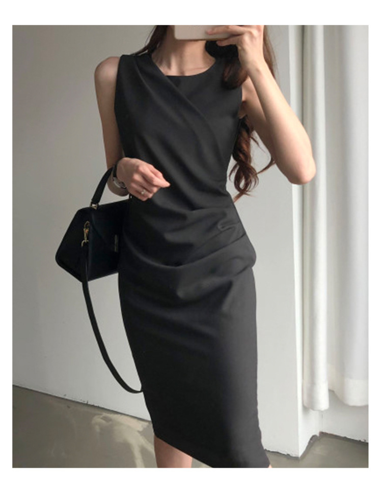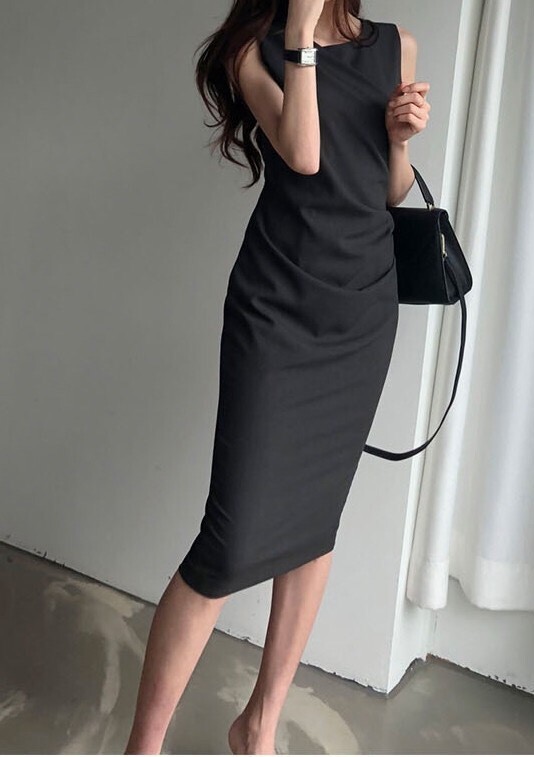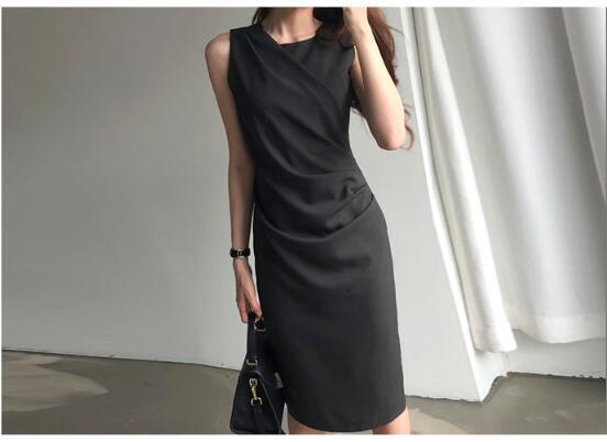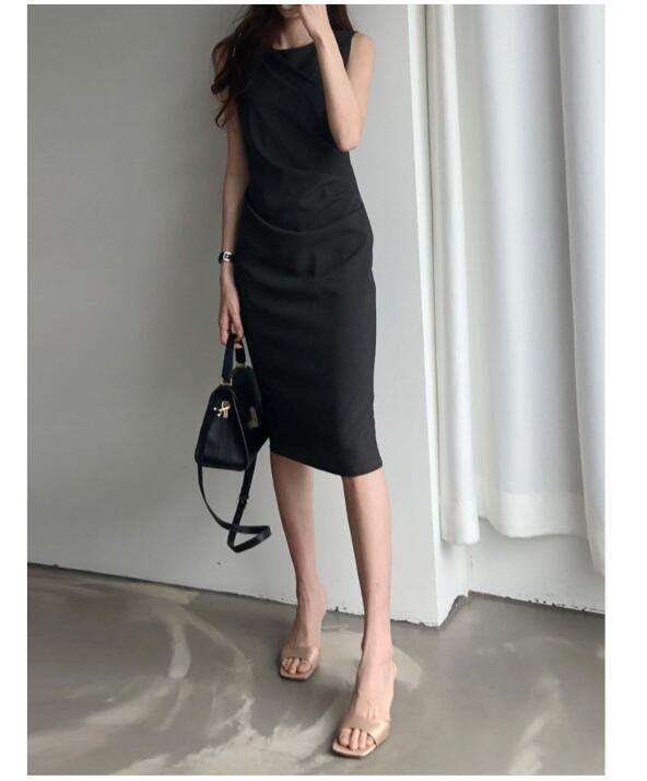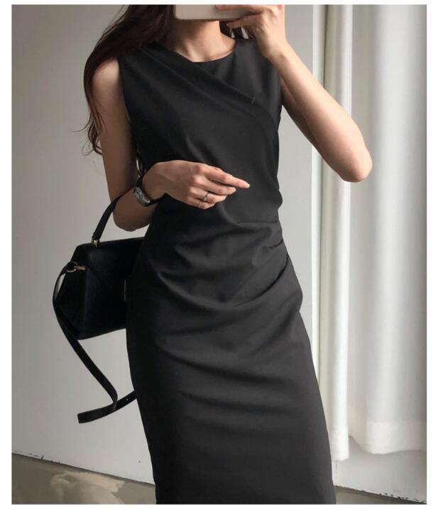 新入荷お色選択可で大人可愛い ひざ丈ドレス ワンピース クルーネック レディース タイト 袖なし 着痩せワンピース S~L 春 夏 通勤 無地